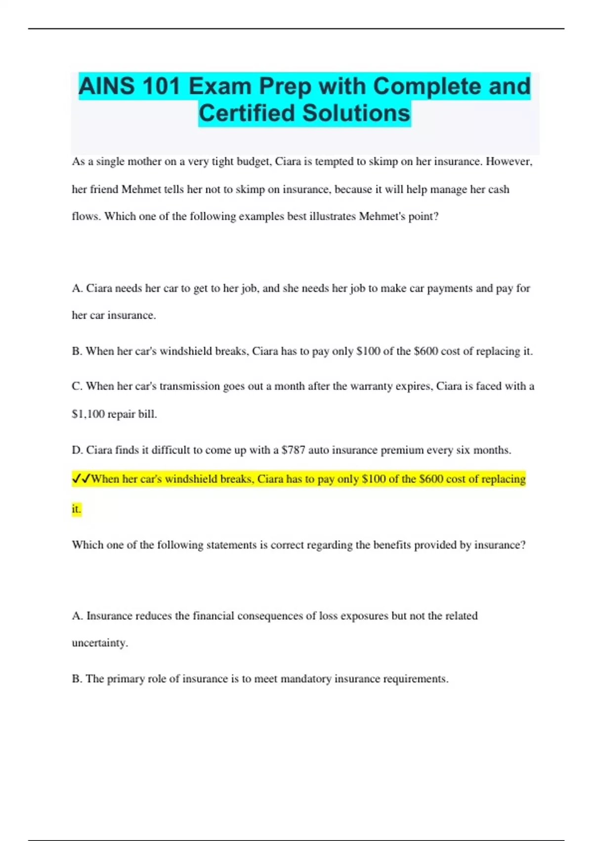 AINS 101 Exam Prep with Complete and Certified Solutions As a single mother on a very tight budget, Ciara is tempted to skimp on her insurance. However, her friend Mehmet tells her not to skimp on insurance, because it will help manage her cash flows. Which one of the following examples best illustrates Mehmet's point? A. Ciara needs her car to get to her job, and she needs her job to make car payments and pay for her car insurance. B. When her car's windshield breaks, Ciara has to pay only $100 of the $600 cost of replacing it. C. When her car's transmission goes out a month after the warranty expires, Ciara is faced with a $1,100 repair bill. D. Ciara finds it difficult to come up with a $787 auto insurance premium every six months. When her car's windshield breaks, Ciara has to pay only $100 of the $600 cost of replacing it. Which one of the following statements is correct regarding the benefits provided by insurance? A. Insurance reduces the financial consequences of loss exposures but not the related uncertainty. B. The primary role of insurance is to meet mandatory insurance requirements. C. The reduction in losses paid by insurers due to risk control measures benefits individual insureds but not society as a whole. D. Insurance helps reduce the financial burden to society by compensating accident victims. Insurance helps reduce the financial burden to society by compensating accident victims. Shelton Industries experienced a fire in its manufacturing plant. Several employees suffered burns and smoke inhalation injuries as they tried to escape the building. Which one of Shelton Industries' commercial property-casualty policies would pay for the employees' injuries and illnesses? Workers compensation insurance A homeowners policy is a type of Personal property-casualty insurance policy. Which one of the following correctly describes a reason for government involvement in property-casualty insurance? A. Selling insurance provides the government with a non-tax source of revenues and profits. B. Government programs can meet legitimate public demands unmet by private insurers. C. Competition from government plans keeps private insurer's premiums competitive. D. Preventing high-risk individuals or activities from being insured is in the public interest. Government programs can meet legitimate public demands unmet by private insurers. Insurance Company wrote a commercial liability policy for a manufacturer of off-road motorcycles. The potential costs of the insured's loss exposure exceed Insurance Company's capacity. Insurance Company could consider which one of the following types of contractual transferring agreement to meet its needs? Reinsurance In an effort to reduce expenses, increase profitability, and reduce human errors; ABC Insurance Company decided to automate most of its personal lines underwriting function. The company now uses standardized application forms that are submitted electronically to one of the company's regional offices. At each regional office, a computer with a scanner reads the applications. The computer has been programmed with acceptable answers to the questions. If the answers on the application are all acceptable, the policy is automatically issued. Rejected applications are automatically forwarded to a human underwriter who reviews them. The use of this technology has reduced the company's expense ratio by two and a half percent, and reduced the time it takes to issue a policy. ABC Insurance Company's use of computers to evaluate applications electronically is an application of A. Radiant sensors. B. Artificial intelligence. C. Artificial intelligence. Jimmy decided to buy a house in his neighborhood that had been foreclosed on by the bank that held the mortgage. He is hoping to do some renovation and repair work on the house, and then sell it for a quick profit. What type of risk is this? Speculative Risk Which one of the following best describes the concept of pooling? A. The financial consequences of unanticipated losses are transferred to an insurer. B. Risk management is concerned with positive and negative risks. C. Insureds share the cost of each other's losses. D. Insurance benefits society as a whole. Insureds share the cost of each other's losses. Which one of the following represents
