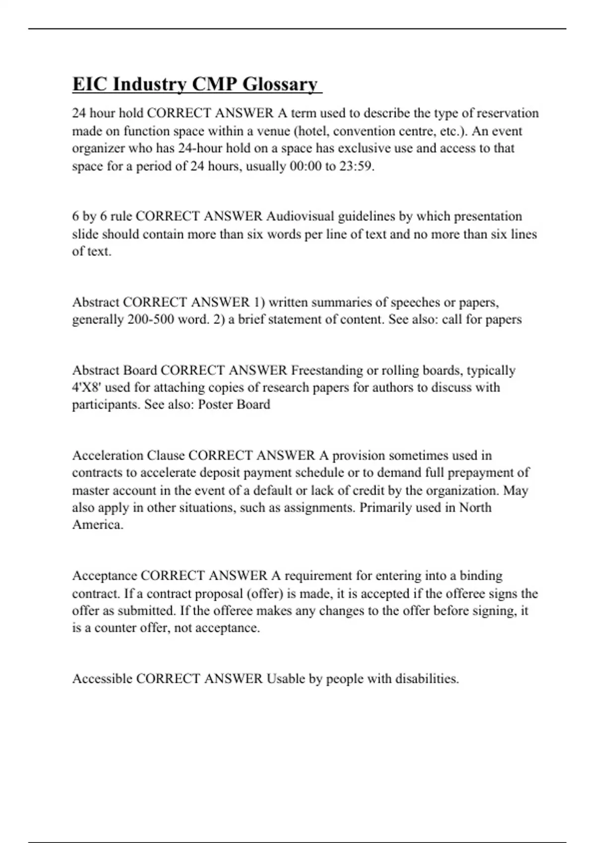 24 hour hold CORRECT ANSWER A term used to describe the type of reservation made on function space within a venue (hotel, convention centre, etc.). An event organizer who has 24-hour hold on a space has exclusive use and access to that space for a period of 24 hours, usually 00:00 to 23:59. 6 by 6 rule CORRECT ANSWER Audiovisual guidelines by which presentation slide should contain more than six words per line of text and no more than six lines of text. Abstract CORRECT ANSWER 1) written summaries of speeches or papers, generally 200-500 word. 2) a brief statement of content. See also: call for papers Abstract Board CORRECT ANSWER Freestanding or rolling boards, typically 4'X8' used for attaching copies of research papers for authors to discuss with participants. See also: Poster Board Acceleration Clause CORRECT ANSWER A provision sometimes used in contracts to accelerate deposit payment schedule or to demand full prepayment of master account in the event of a default or lack of credit by the organization. May also apply in other situations, such as assignments. Primarily used in North America. Acceptance CORRECT ANSWER A requirement for entering into a binding contract. If a contract proposal (offer) is made, it is accepted if the offeree signs the offer as submitted. If the offeree makes any changes to the offer before signing, it is a counter offer, not acceptance. Accessible CORRECT ANSWER Usable by people with disabilities. Accommodation CORRECT ANSWER 1) any seat, berth, room,