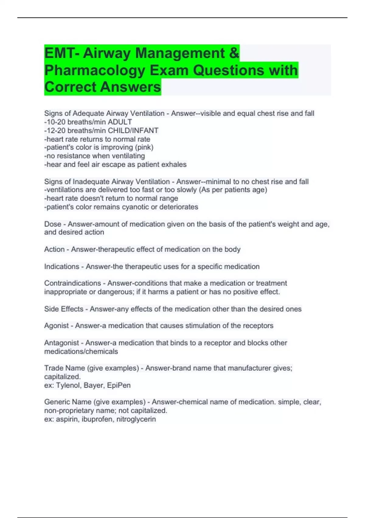 EMT- Airway Management & Pharmacology Exam Questions with Correct Answers
