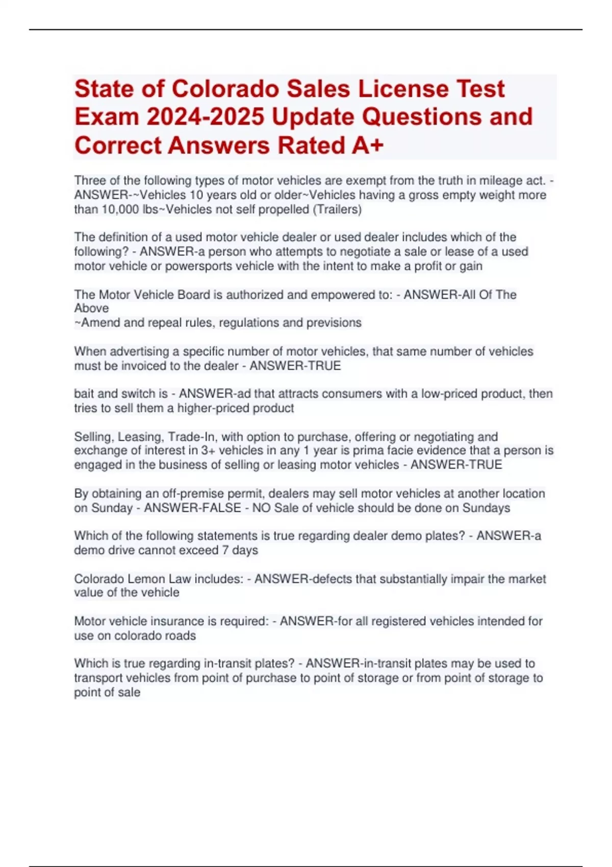 State of Colorado Sales License Test Exam Update Questions and Correct Answers Rated A+