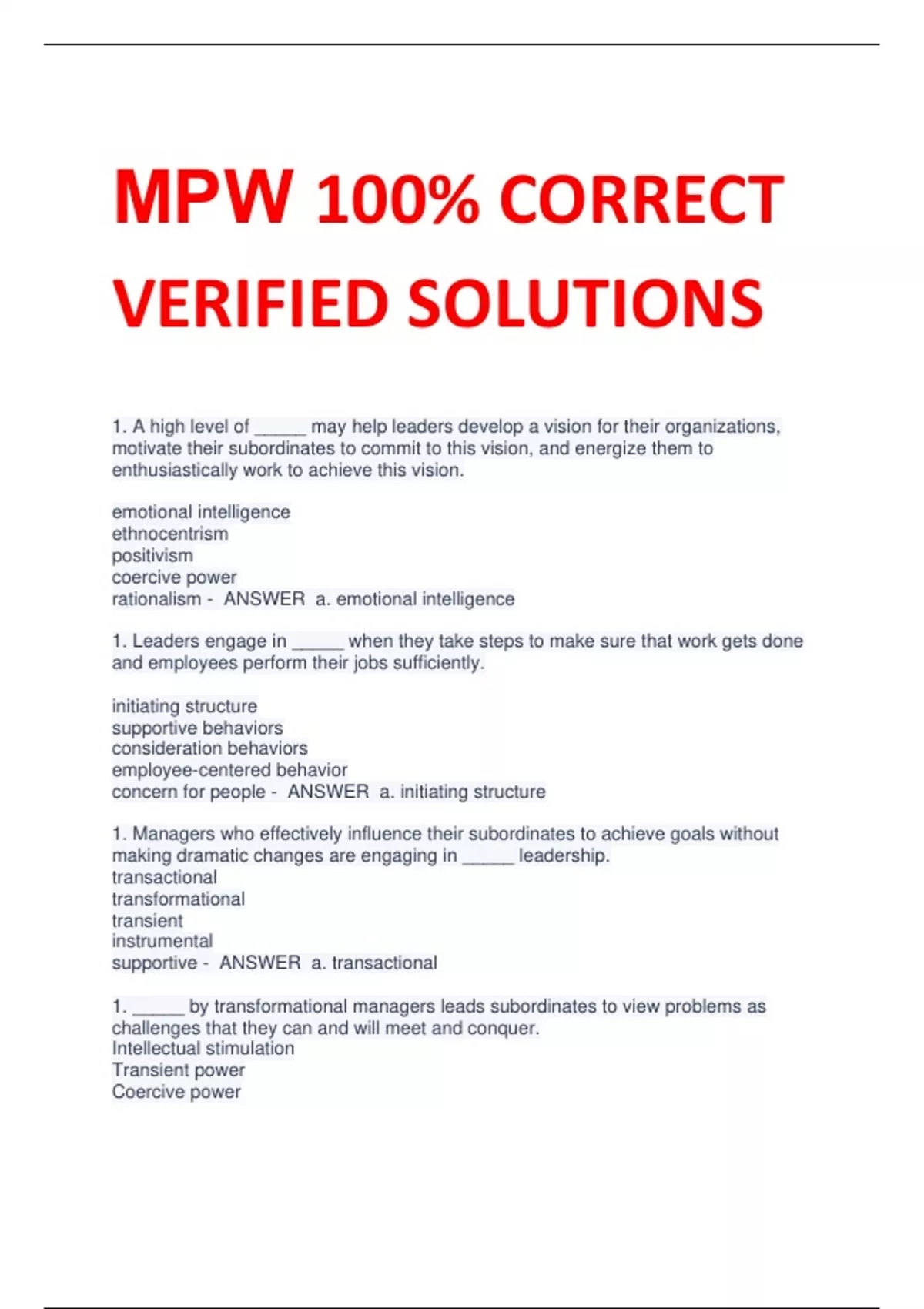 MPW 100% CORRECT VERIFIED SOLUTIONS 1. A high level of _____ may help leaders develop a vision for their organizations, motivate their subordinates to commit to this vision, and energize them to enthusiastically work to achieve this vision. emotional intelligence ethnocentrism positivism coercive power rationalism - ANSWER a. emotional intelligence 1. Leaders engage in _____ when they take steps to make sure that work gets done and employees perform their jobs sufficiently. initiating structure supportive behaviors consideration behaviors employee-centered behavior concern for people - ANSWER a. initiating structure 1. Managers who effectively influence their subordinates to achieve goals without making dramatic changes are engaging in _____ leadership. transactional transformational transient instrumental supportive - ANSWER a. transactional 1. _____ by transformational managers leads subordinates to view problems as challenges that they can and will meet and conquer. Intellectual stimulation Transient power Coercive power Transactional leadership Virtual stimulation - ANSWER a. Intellectual stimulation 1. Which of the following is true about empowerment? It requires managers to spend more time on day-to-day supervision. It seldom produces high performances. It can result in dangerous working conditions. It increases employees' motivation and commitment. It decreases employees' involvement. - ANSWER d. It increases employees' motivation and commitment. 1. Managers can increase their _____ power by taking time to get to know their subordinates and showing interest in and concern for them. reward transient coercive referent virtual - ANSWER d. referent 1. Stacy fired Jan for unethical behavior, exercising _____ power. virtual instrumental referent informal coercive - ANSWER e. coercive 1. According to the path-goal theory, _____ are similar to consideration and include expressing concern for subordinates and looking out for their best interests. directive behaviors supportive behaviors task-oriented behaviors achievement-oriented behaviors. structural behaviors - ANSWER b. supportive behavior 1. Lillian shows her subordinates that she trusts and respects them and cares about them. According to the behavior model of leadership, Lillian engages in initiating structure. consideration. task-orientated behavior. job-oriented behavior. task-structuring. - ANSWER b. consideration 1. The lack of a consistent relationship between leader traits and leader effectiveness led to the development of the trait model. Fiedler's contingency model. House's path-goal theory. leader substitutes model. behavior model. - ANSWER e. behavior model 1. The serving staff at Mary's Diner does not have to check with their supervisor before offering customers free dessert when the customers are dissatisfied with their dine-in experience. This is an example of employee empowerment. reward power. expert power. servant leadership. personal power. - ANSWER a . employee empowerment 1. _____ models propose that whether a leader who possesses certain traits or performs certain behaviors is effective depends on the situation or context. Trait Contingency Empowerment Behavior Structural - ANSWER b. contingency 1. What type of leaders share power with followers and strive to ensure that followers' well-being is enhanced? entrepreneurs coercive leaders servant leaders transactional leaders Intrapreneurs - ANSWER c. servant leaders QUESTION 14 1. Marco hires new employees, assigns them work, and monitors their performance. What type of power does Marco use? transformational legitimate informal transient instrumental - ANSWER b .legitimate 1. Which model of leadership is based on the premise that effective leaders possess personal qualities that set them apart from ineffective leaders? task-oriented model path-goal model contingency model trait model relationship-oriented model - ANSWE
