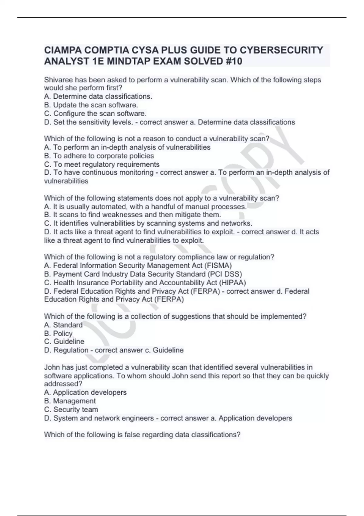 CIAMPA COMPTIA CYSA PLUS GUIDE TO CYBERSECURITY ANALYST 1E MINDTAP EXAM SOLVED #10