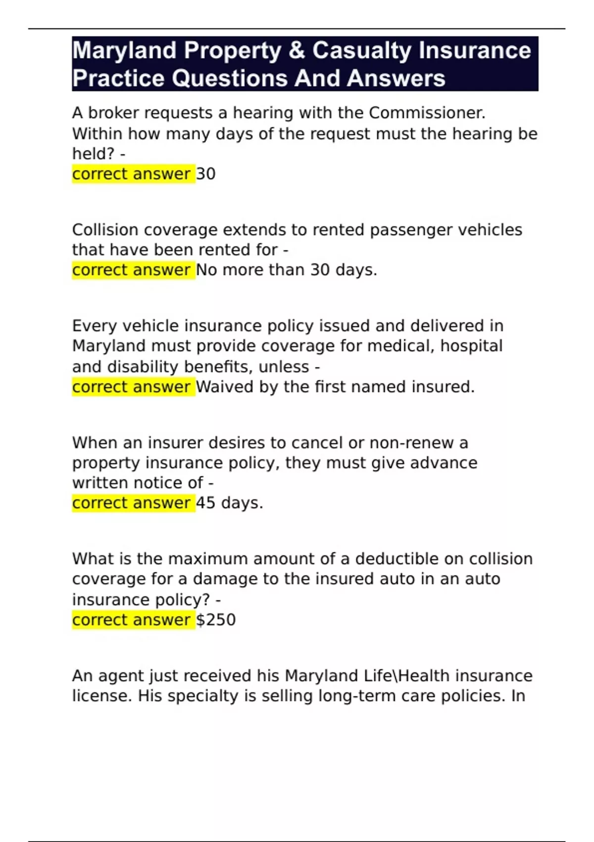 Maryland Property & Casualty Insurance Practice Questions And Answers