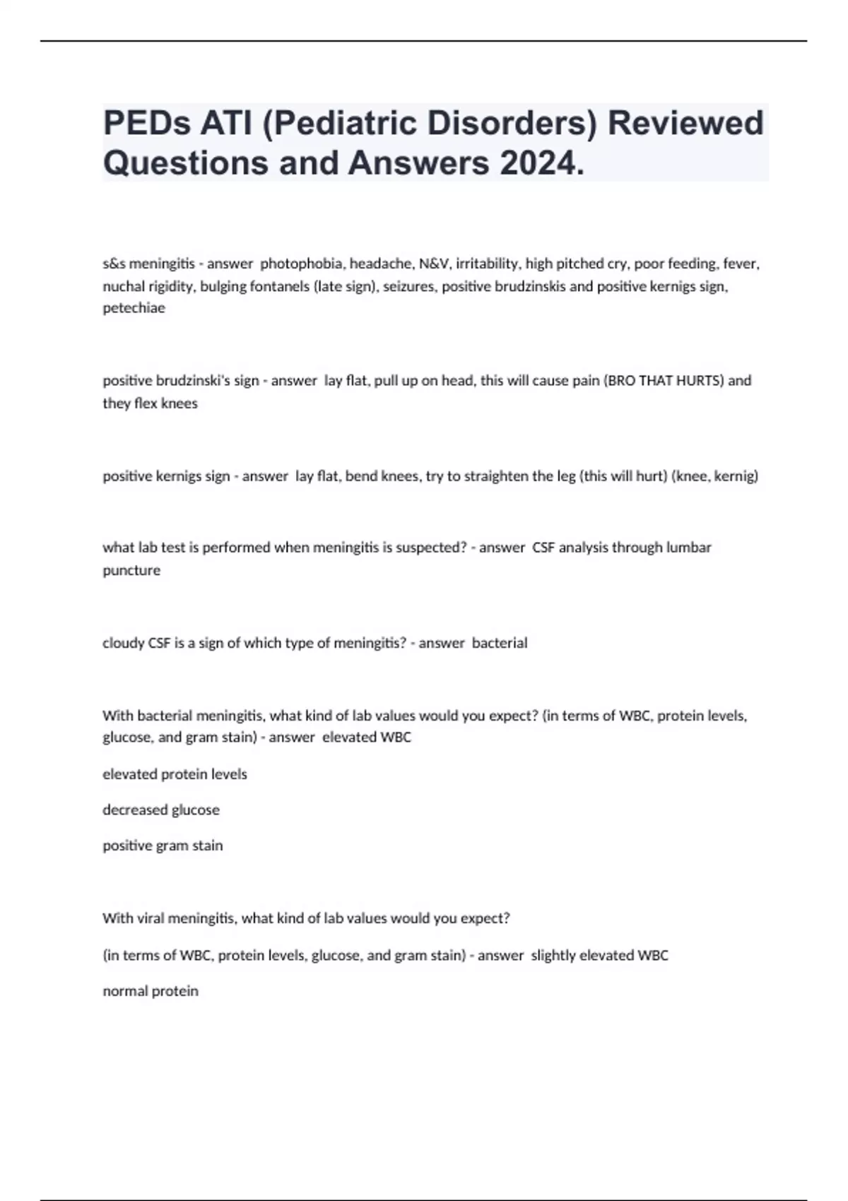 PEDs ATI (Pediatric Disorders) Reviewed Questions and Answers 2024. s&s meningitis photophobia, headache, N&V, irritability, high pitched cry, poor feeding, fever, nuchal rigidity, bulging fontanels (late sign), seizures, positive brudzinskis and positive kernigs sign, petechiae positive brudzinski's sign lay flat, pull up on head, this will cause pain (BRO THAT HURTS) and they flex knees positive kernigs sign lay flat, bend knees, try to straighten the leg (this will hurt) (knee, kernig) what lab test is performed when meningitis is suspected? CSF analysis through lumbar puncture