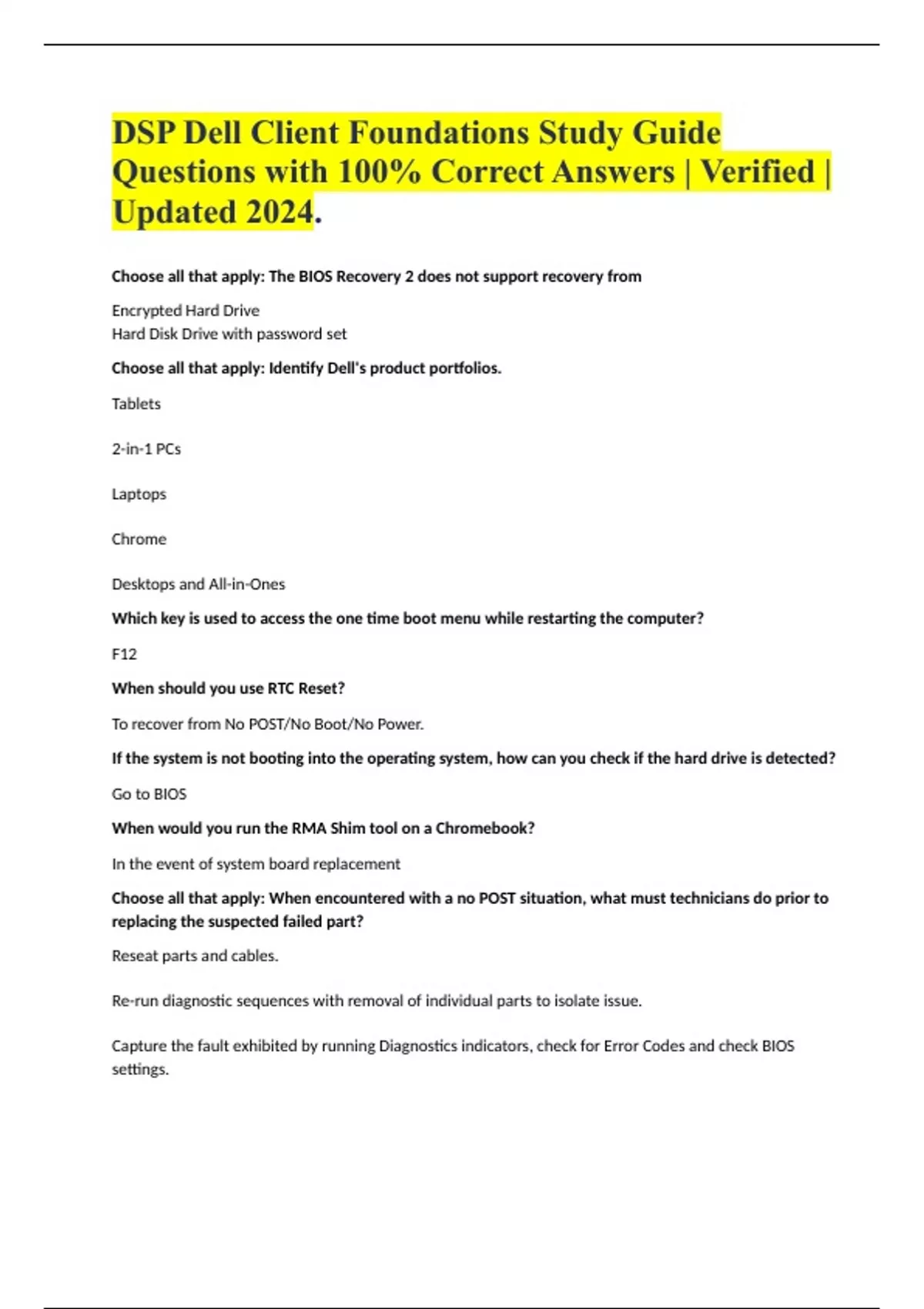 DSP Dell Client Foundations Study Guide Questions with 100% Correct Answers | Verified | Updated 2024. Choose all that apply: The BIOS Recovery 2 does not support recovery from Encrypted Hard Drive Hard Disk Drive with password set Choose all that apply: Identify Dell's product portfolios. Tablets 2-in-1 PCs Laptops Chrome Desktops and All-in-Ones Which key is used to access the one time boot menu while restarting the computer? F12 When should you use RTC Reset? To recover from No POST/No Boot/No Power. If the system is not booting into the operating system, how can you check if the hard drive is detected? Go to BIOS When would you run the RMA Shim tool on a Chromebook? In the event of system board replacement Choose all that apply: When encountered with a no POST situation, what must technicians do prior to replacing the suspected failed part? Reseat parts and cables. Re-run diagnostic sequences with removal of individual parts to isolate issue. Capture the fault exhibited by running Diagnostics indicators, check for Error Codes and check BIOS settings.