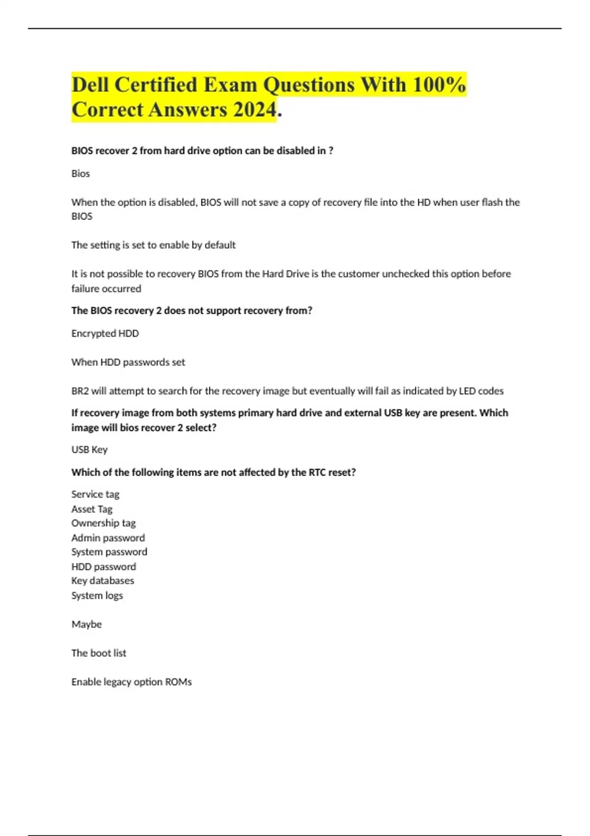Dell Certified Exam Questions With 100% Correct Answers 2024. BIOS recover 2 from hard drive option can be disabled in ? Bios When the option is disabled, BIOS will not save a copy of recovery file into the HD when user flash the BIOS The setting is set to enable by default It is not possible to recovery BIOS from the Hard Drive is the customer unchecked this option before failure occurred The BIOS recovery 2 does not support recovery from? Encrypted HDD When HDD passwords set BR2 will attempt to search for the recovery image but eventually will fail as indicated by LED codes If recovery image from both systems primary hard drive and external USB key are present. Which image will bios recover 2 select? USB Key Which of the following items are not affected by the RTC reset? Service tag Asset Tag Ownership tag Admin password System password HDD password Key databases System logs Maybe The boot list Enable legacy option ROMs