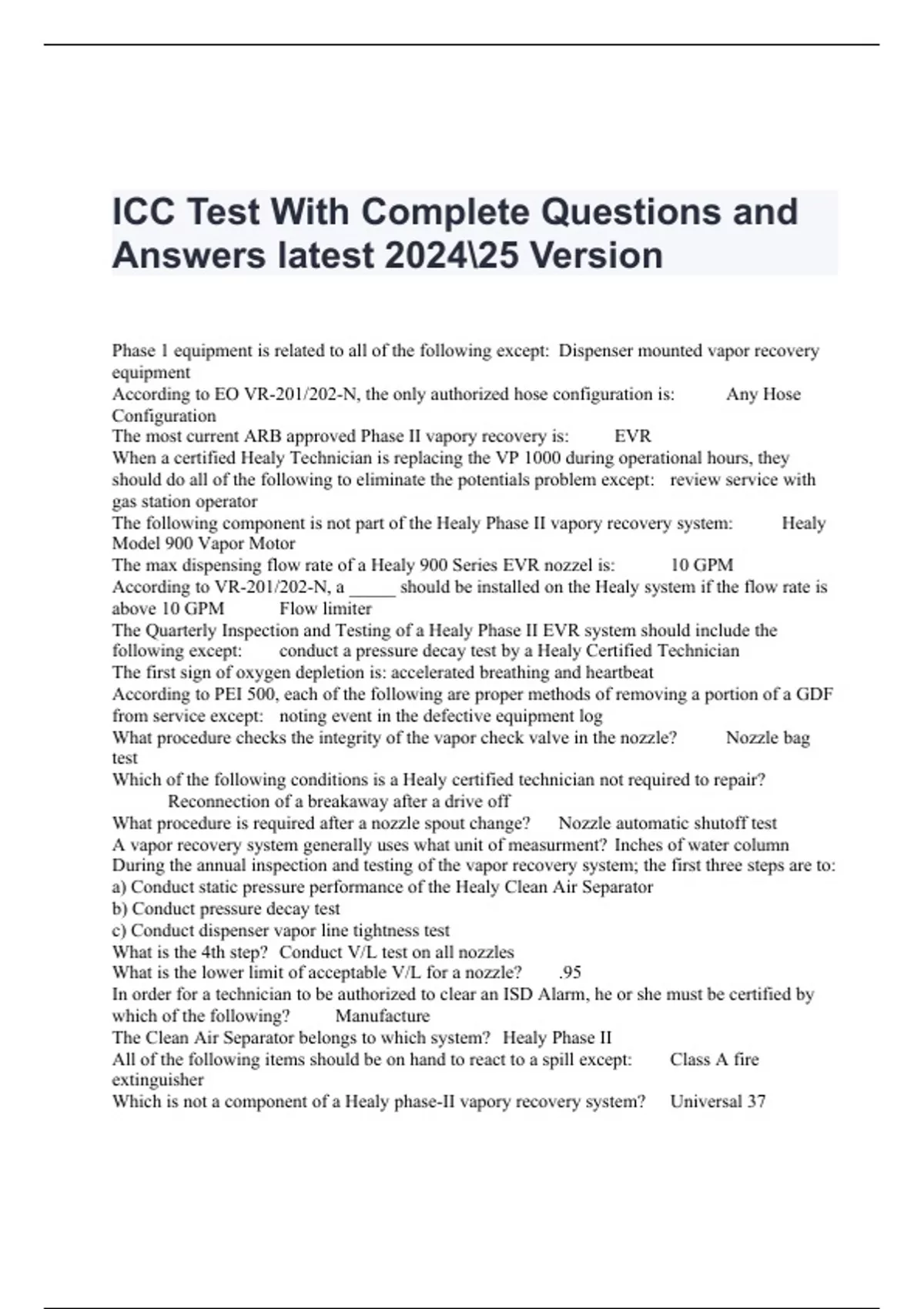ICC Test With Complete Questions and Answers latest 202425 Version Phase 1 equipment is related to all of the following except: Dispenser mounted vapor recovery equipment According to EO VR-201/202-N, the only authorized hose configuration is: Any Hose Configuration The most current ARB approved Phase II vapory recovery is: EVR When a certified Healy Technician is replacing the VP 1000 during operational hours, they should do all of the following to eliminate the potentials problem except: review service with gas station operator The following component is not part of the Healy Phase II vapory recovery system: Healy Model 900 Vapor Motor The max dispensing flow rate of a Healy 900 Series EVR nozzel is: 10 GPM According to VR-201/202-N, a _____ should be installed on the Healy system if the flow rate is above 10 GPM Flow limiter The Quarterly Inspection and Testing of a Healy Phase II EVR system should include the following except: conduct a pressure decay test by a Healy Certified Technician The first sign of oxygen depletion is: accelerated breathing and heartbeat According to PEI 500, each of the following are proper methods of removing a portion of a GDF from service except: noting event in the defective equipment log What procedure checks the integrity of the vapor check valve in the nozzle? Nozzle bag test Which of the following conditions is a Healy certified technician not required to repair? Reconnection of a breakaway after a drive off What procedure is required after a nozzle spout change? Nozzle automatic shutoff test A vapor recovery system generally uses what unit of measurment? Inches of water column During the annual inspection and testing of the vapor recovery system; the first three steps are to: a) Conduct static pressure performance of the Healy Clean Air Separator b) Conduct pressure decay test c) Conduct dispenser vapor line tightness test What is the 4th step? Conduct V/L test on all nozzles What is the lower limit of acceptable V/L for a nozzle? .95 In order for a technician to be authorized to clear an ISD Alarm, he or she must be certified by which of the following? Manufacture The Clean Air Separator belongs to which system? Healy Phase II All of the following items should be on hand to react to a spill except: Class A fire extinguisher Which is not a component of a Healy phase-II vapory recovery system? Universal 37 Which of the following is not part of hanging hardware? Husky Model 4885 What is mounted on the top of the manifold vent mast? Pressure/vacuum vent cap Connecting a copper wire from the tank to the earth constitutes what? Grounding What is the maximum allowable fuel flow from the dispenser? 10 GPM What is the maximum length of the hose/breakaway/swivel when measured to the base of the nozzle? 20 feet Compounds with a high vapor pressure, such as gasoline, will evaporate readily and will typically: have a low flash point A liquid removal device should be installed on a balance system at: the low point of the hose between the vehicle and dispenser with the nozzle in the vehivle The vapor flows through the following paths on a balance system, except inter hose ______ has recently re-written the regulations governing VR systems in California (enhances vapor recovery) CARB Which is not part of a Phase I system? clean air seperator A breakaway reconnection must be logged on: GDF maintenance log The Phi-Tite rotatable adapters are not field serviceable except: vapor poppet The ISD system shall maintain an electronic archive of monthly reports for a period of: 12 months Lubricating the o-ring or Quad Seal before installing the hose assembly into a breakaway nozzle with: motor oil The insertion interlocks on a balance system nozzle: prevent fuel from dispensing unless the bellows are compressed Following a start-up, the spill container drain valve on the Phil-Tite should be tested every: 3 years When conducting a nozzle bag test, use any plastic bad large enough to enclose the nozzle while not having a thickness greater than 2 mils on: both nozzles on the dispenser The Healy 900 Series Nozzle consists of all of the folloiwing parts except: Bellows The Healy Clamp (795) is used to connect: the breakaway A combustible gas indicator (CGI) measures: flammable vapors (LEL) A Level II Qualified Person is trained to evaluate and perform the following functions except: replacing nozzles What tests are not required after a breakaway is reconnected? Vapor motor What protects the hanging hardware from excessive force? Breakaway Which of the following isn't part of the quarterly inpection? Pressure decay test What is the proper way to clean up a small gas spill? Pick it up w/absorbent material and dispose of it properly What procedure is not required during a vapor motor replacement? Replacement of nozzle When may a vapor recovery system component be substituted for a regular component? When the part number is listed as a certified component on the Executive Order Differences in vapor recovery guidelines may depend on Different standards between different regulatory agencies What is not post of the Healy Phase I EVR vapor recovery system? Clean Air Seperator What is not part of the Healy Phase II EVR vapor recovery system? Shear valve