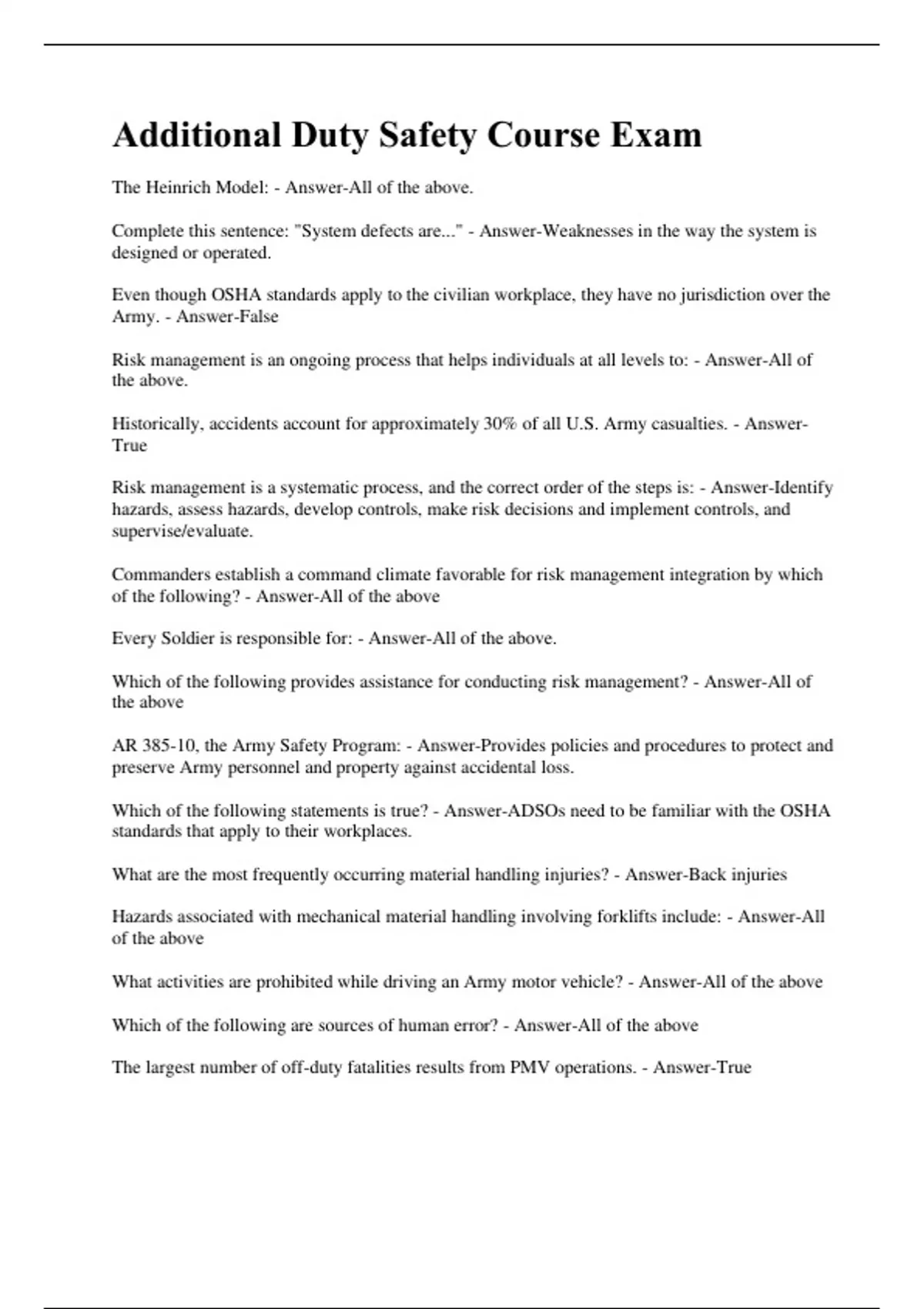 The Heinrich Model: - Answer-All of the above. Complete this sentence: "System defects are..." - Answer-Weaknesses in the way the system is designed or operated. Even though OSHA standards apply to the civilian workplace, they have no jurisdiction over the Army. - Answer-False Risk management is an ongoing process that helps individuals at all levels to: - Answer-All of the above. Historically, accidents account for approximately 30% of all U.S. Army casualties. - AnswerTrue Risk management is a systematic process, and the correct order of the steps is: - Answer-Identify hazards, assess hazards, develop controls, make risk decisions and implement controls, and supervise/evaluate. Commanders establish a command climate favorable for risk management integration by which of the following? - Answer-All of the above Every Soldier is responsible for: - Answer-All of the above. Which of the following provides assistance for conducting risk management? - Answer-All of the above AR 385-10, the Army Safety Program: - Answer-Provides policies and procedures to protect and preserve Army personnel and property against accidental loss. Which of the following statements is true? - Answer-ADSOs need to be familiar with the OSHA standards that apply to their workplaces. What are the most frequently occurring material handling injuries? - Answer-Back injuries Hazards associated with mechanical material handling involving forklifts include: - Answer-All of the above What activities are prohibited while driving an Army motor vehicle? - Answer-All of the above Which of the following are sources of human error? - Answer-All of the above The largest number of off-duty fatalities results from PMV operations. - Answer-True