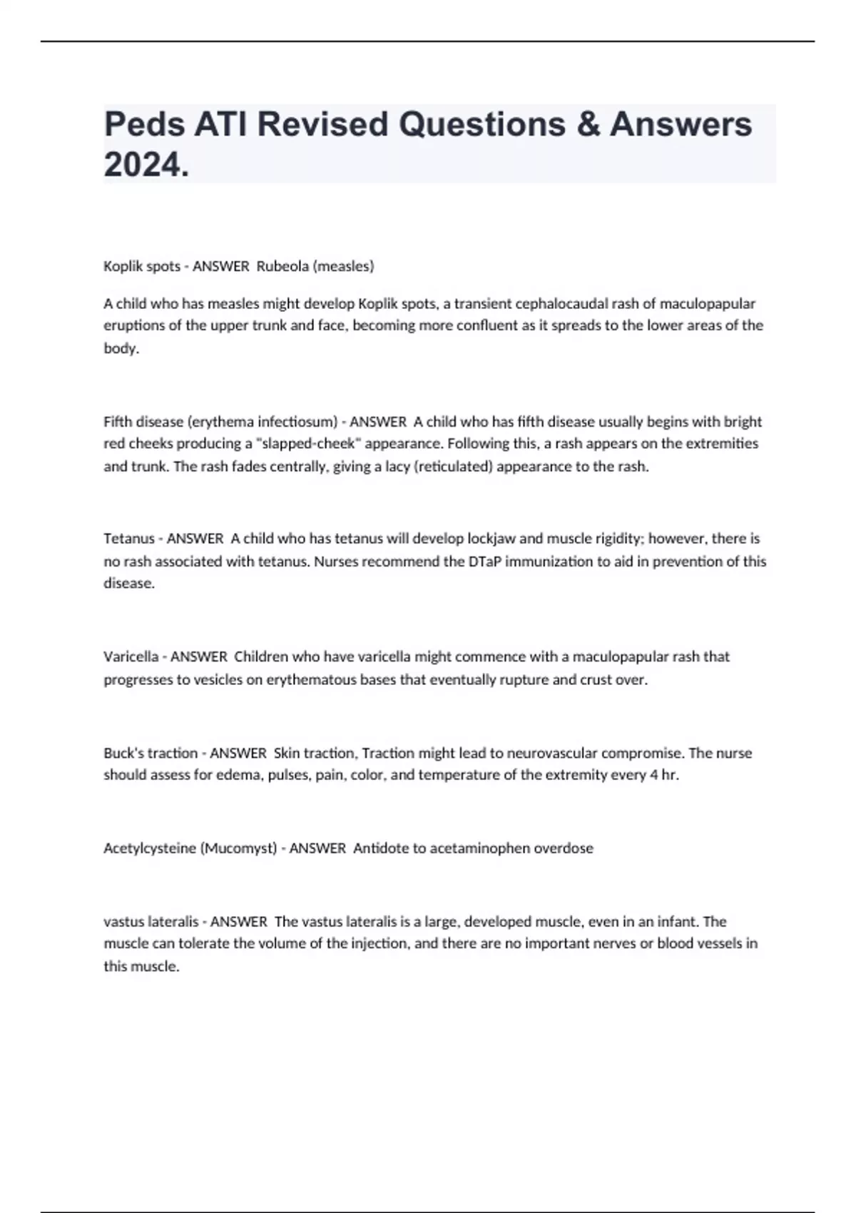 Peds ATI Revised Questions & Answers 2024. Koplik spots Rubeola (measles) A child who has measles might develop Koplik spots, a transient cephalocaudal rash of maculopapular eruptions of the upper trunk and face, becoming more confluent as it spreads to the lower areas of the body. Fifth disease (erythema infectiosum) A child who has fifth disease usually begins with bright red cheeks producing a "slapped-cheek" appearance. Following this, a rash appears on the extremities and trunk. The rash fades centrally, giving a lacy (reticulated) appearance to the rash. Tetanus A child who has tetanus will develop lockjaw and muscle rigidity; however, there is no rash associated with tetanus. Nurses recommend the DTaP immunization to aid in prevention of this disease. Varicella Children who have varicella might commence with a maculopapular rash that progresses to vesicles on erythematous bases that eventually rupture and crust over.