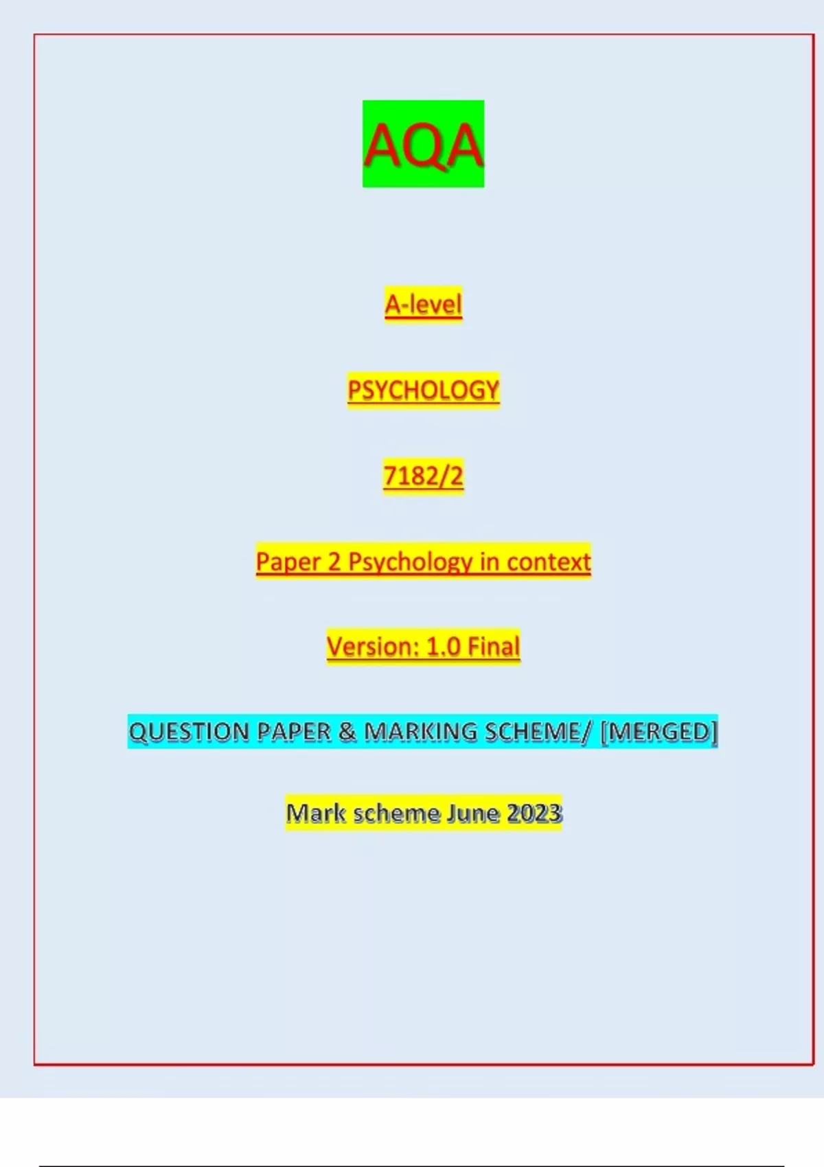AQA A LEVEL PSYCHOLOGY 7182/2 PSYCHOLOGY IN CONTEXT VERSION 1.0 FINAL |QUESTION PAPER AND MERGED MARKING SCHEME JUNE 2023