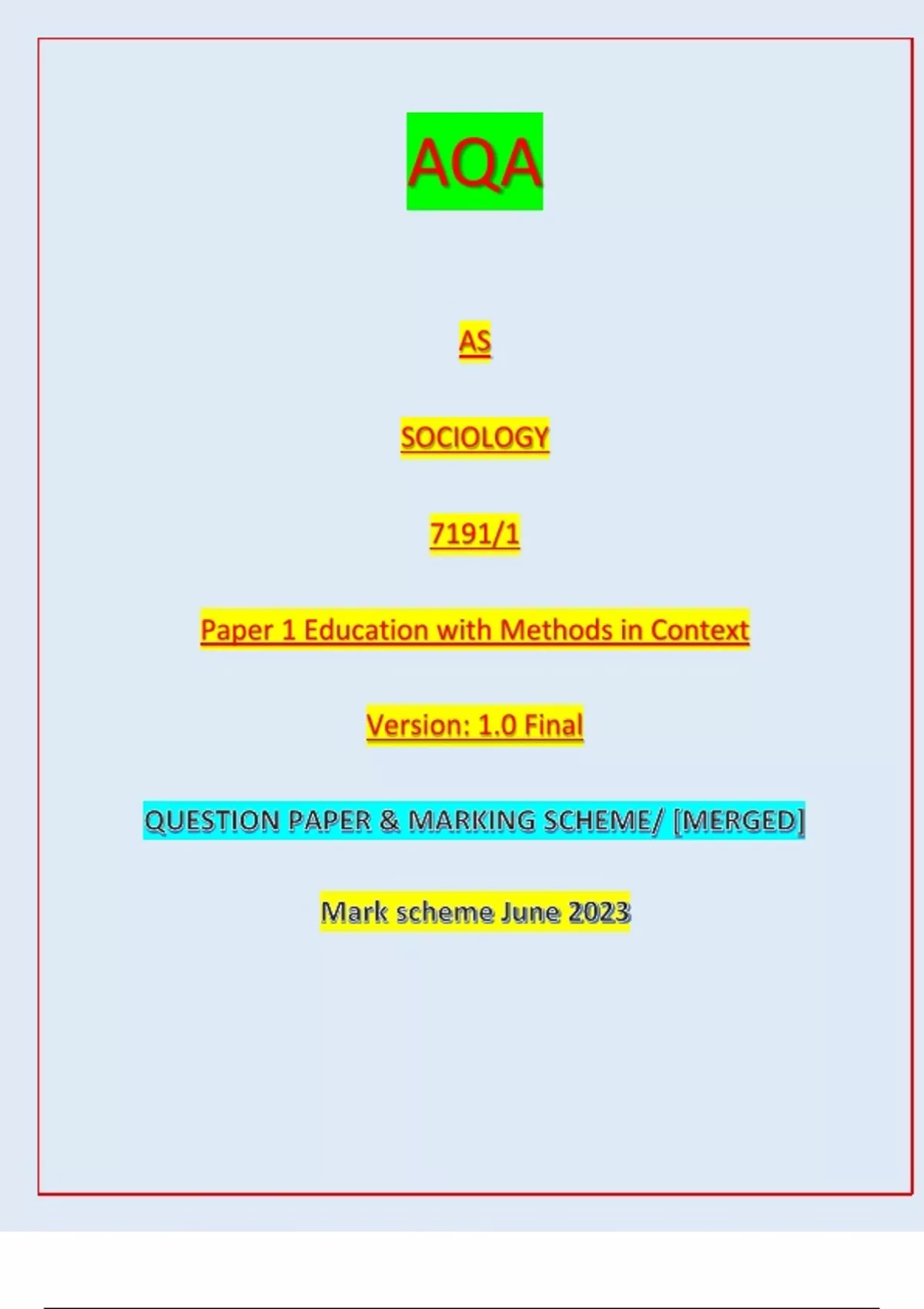 AQA AS SOCIOLOGY 7191/1 PAPER 1 EDUCATION WITH METHODS IN CONTEXT VERSION 1.0 FINAL |QUESTION PAPER AND MERGED MARKING SCHEME JUNE 2023