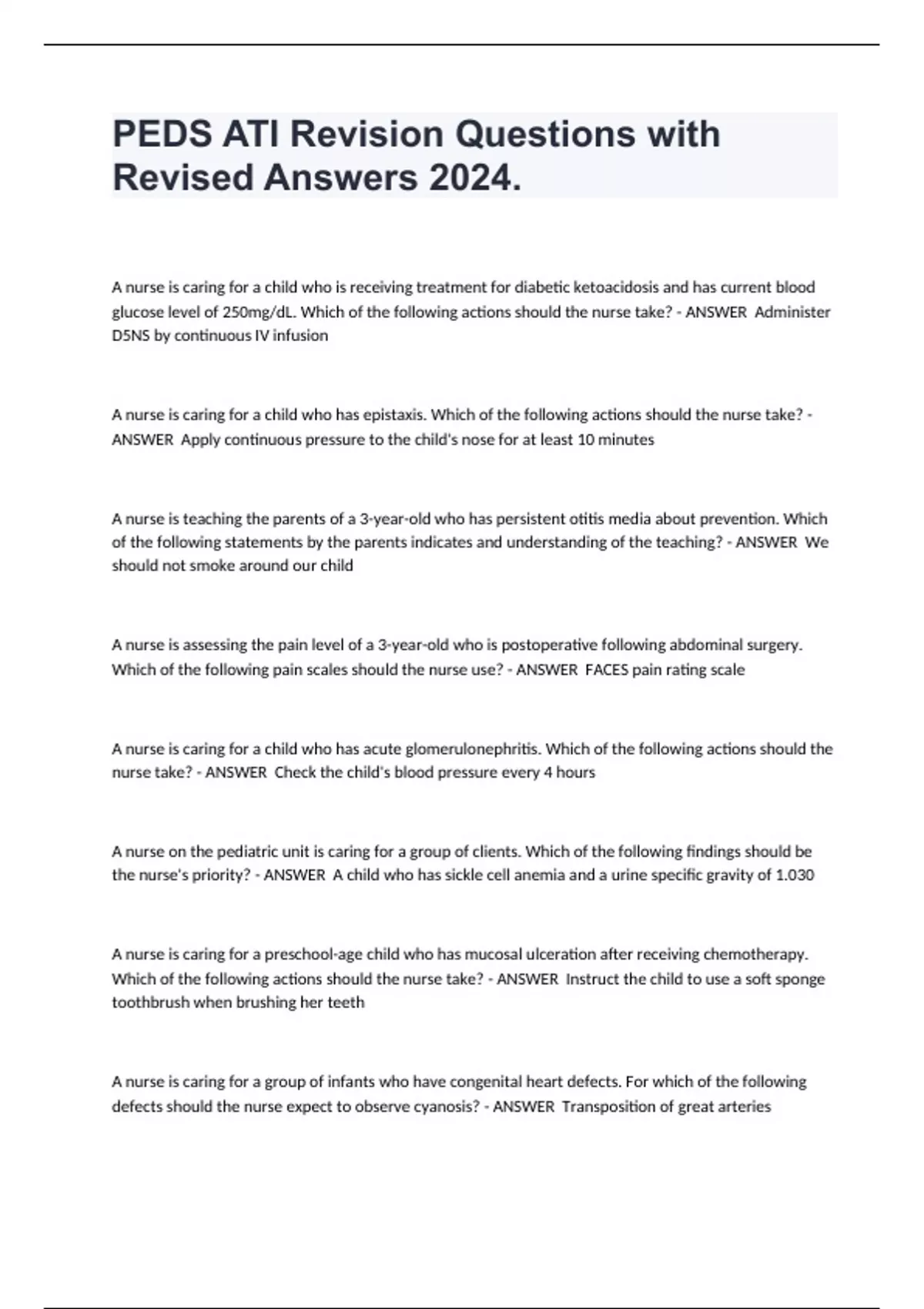 PEDS ATI Revision Questions with Revised Answers 2024. A nurse is caring for a child who is receiving treatment for diabetic ketoacidosis and has current blood glucose level of 250mg/dL. Which of the following actions should the nurse take? Administer D5NS by continuous IV infusion A nurse is caring for a child who has epistaxis. Which of the following actions should the nurse take? Apply continuous pressure to the child's nose for at least 10 minutes A nurse is teaching the parents of a 3-year-old who has persistent otitis media about prevention. Which of the following statements by the parents indicates and understanding of the teaching? We should not smoke around our child A nurse is assessing the pain level of a 3-year-old who is postoperative following abdominal surgery. Which of the following pain scales should the nurse use? FACES pain rating scale