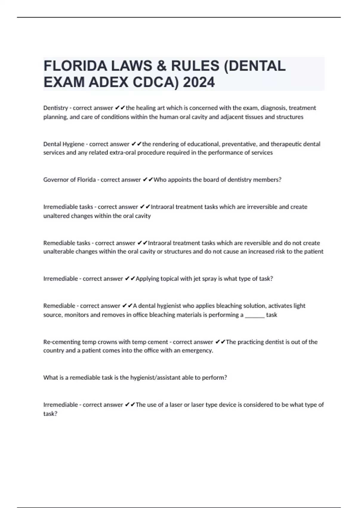 Dentistry - correct answer the healing art which is concerned with the exam, diagnosis, treatment planning, and care of conditions within the human oral cavity and adjacent tissues and structures Dental Hygiene - correct answer the rendering of educational, preventative, and therapeutic dental services and any related extra-oral procedure required in the performance of services Governor of Florida - correct answer Who appoints the board of dentistry members? Irremediable tasks - correct answer Intraoral treatment tasks which are irreversible and create unaltered changes within the oral cavity Remediable tasks - correct answer Intraoral treatment tasks which are reversible and do not create unalterable changes within the oral cavity or structures and do not cause an increased risk to the patient Irremediable - correct answer Applying topical with jet spray is what type of task? Remediable - correct answer A dental hygienist who applies bleaching solution, activates light source, monitors and removes in office bleaching materials is performing a ______ task Re-cementing temp crowns with temp cement - correct answer The practicing dentist is out of the cou