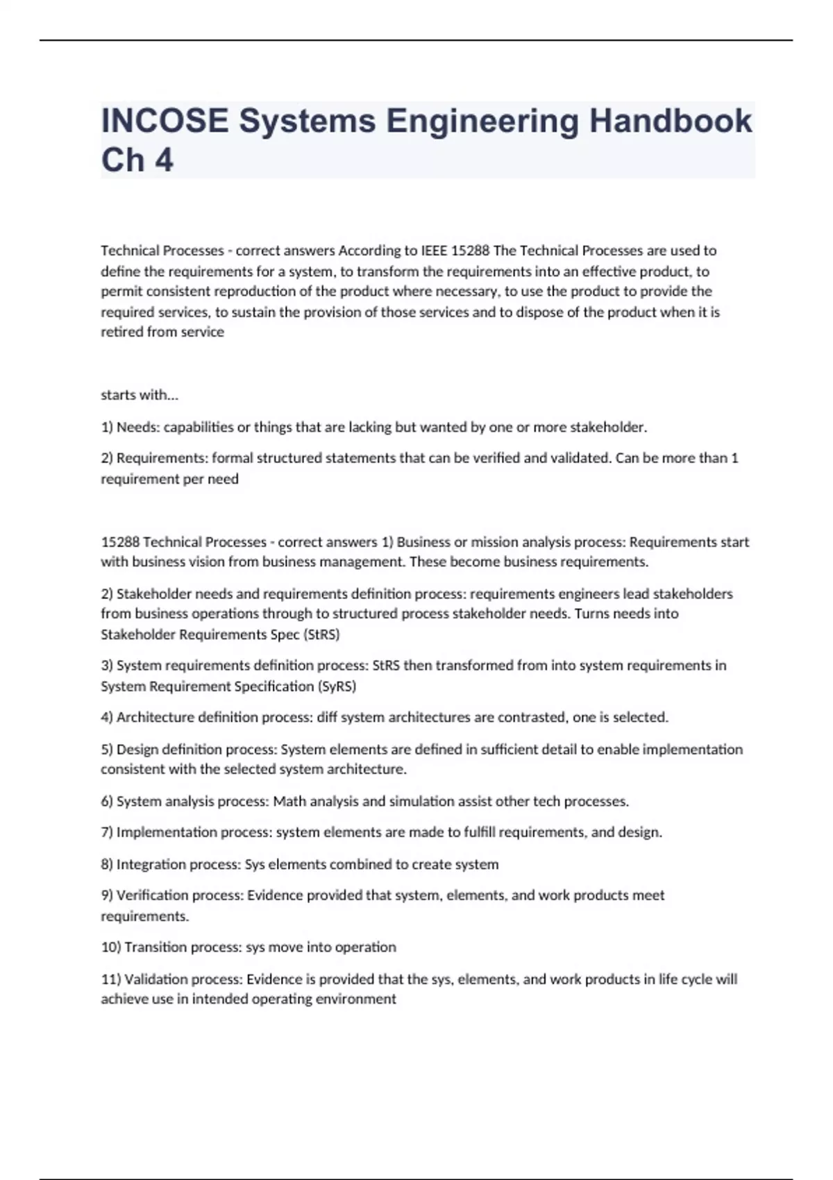 INCOSE Systems Engineering Handbook Ch 4 Question and answers 100% correct 2024Technical Processes - correct answers According to IEEE 15288 The Technical Processes are used to define the requirements for a system, to transform the requirements into an effective product, to permit consistent reproduction of the product where necessary, to use the product to provide the required services, to sustain the provision of those services and to dispose of the product when it is retired from service starts with... 1) Needs: capabilities or things that are lacking but wanted by one or more stakeholder. 2) Requirements: formal structured statements that can be verified and validated. Can be more than 1 requirement per need 15288 Technical Processes - correct answers 1) Business or mission analysis process: Requirements start with business vision from business management. These become business requirements. 2) Stakeholder needs and requirements definition process: requirements engineers lead stakeholders from business operations through to structured process stakeholder needs. Turns needs into Stakeholder Requirements Spec (StRS) 3) System requirements definition process: StRS then transformed from into system requirements in System Requirement Specification (SyRS) 4) Architecture definition process: diff system architectures are contrasted, one is selected. 5) Design definition process: System elements are defined in sufficient detail to enable implementation consistent with the selected system architecture. 6) System analysis process: Math analysis and simulation assist other tech processes. 7) Implementation process: system elements are made to fulfill requirements, and design. 8) Integration process: Sys elements combined to create system 9) Verification process: Evidence provided that system, elements, and work products meet requirements.