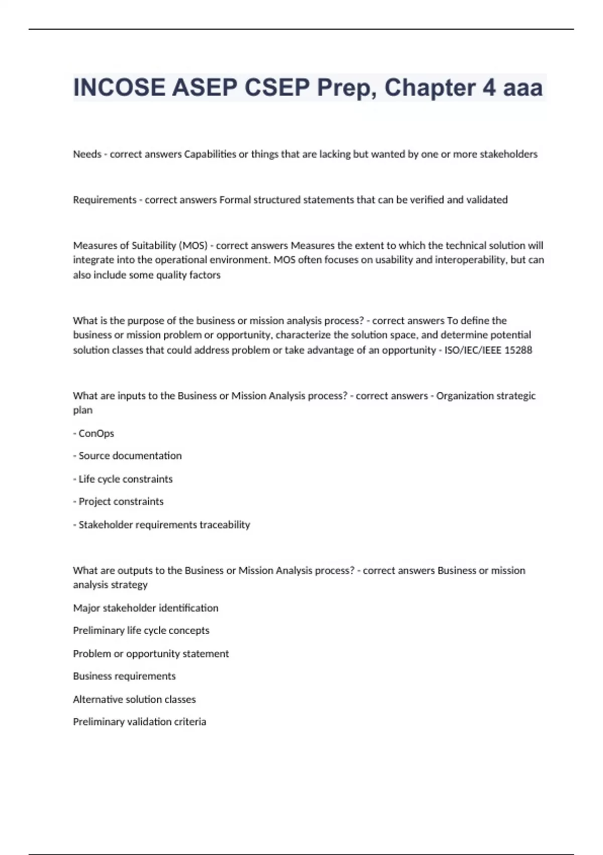 INCOSE ASEP CSEP Prep, Chapter 4 Question and answers already passed 2024 Needs - correct answers Capabilities or things that are lacking but wanted by one or more stakeholders Requirements - correct answers Formal structured statements that can be verified and validated Measures of Suitability (MOS) - correct answers Measures the extent to which the technical solution will integrate into the operational environment. MOS often focuses on usability and interoperability, but can also include some quality factors What is the purpose of the business or mission analysis process? - correct answers To define the business or mission problem or opportunity, characterize the solution space, and determine potential solution classes that could address problem or take advantage of an opportunity - ISO/IEC/IEEE 15288 What are inputs to the Business or Mission Analysis process? - correct answers - Organization strategic plan - ConOps - Source documentation - Life cycle constraints - Project constraints - Stakeholder requirements traceability