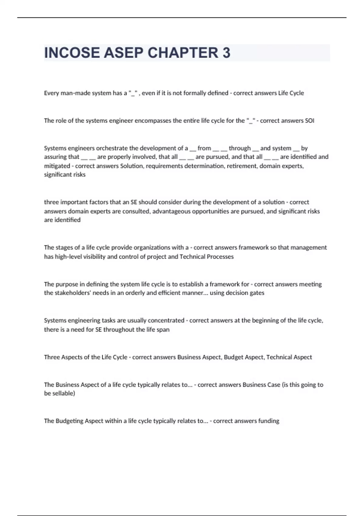 INCOSE ASEP CHAPTER 3 Question and answers 2024 verified to passEvery man‐made system has a "_" , even if it is not formally defined - correct answers Life Cycle The role of the systems engineer encompasses the entire life cycle for the "_" - correct answers SOI Systems engineers orchestrate the development of a __ from __ __ through __ and system __ by assuring that __ __ are properly involved, that all __ __ are pursued, and that all __ __ are identified and mitigated - correct answers Solution, requirements determination, retirement, domain experts, significant risks three important factors that an SE should consider during the development of a solution - correct answers domain experts are consulted, advantageous opportunities are pursued, and significant risks are identified The stages of a life cycle provide organizations with a - correct answers framework so that management has high‐level visibility and control of project and Technical Processes The purpose in defining the system life cycle is to establish a framework for - correct answers meeting the stakeholders' needs in an orderly and efficient manner... using decision gates Systems engineering tasks are usually concentrated - correct answers at the beginning of the life cycle, there is a need for SE throughou