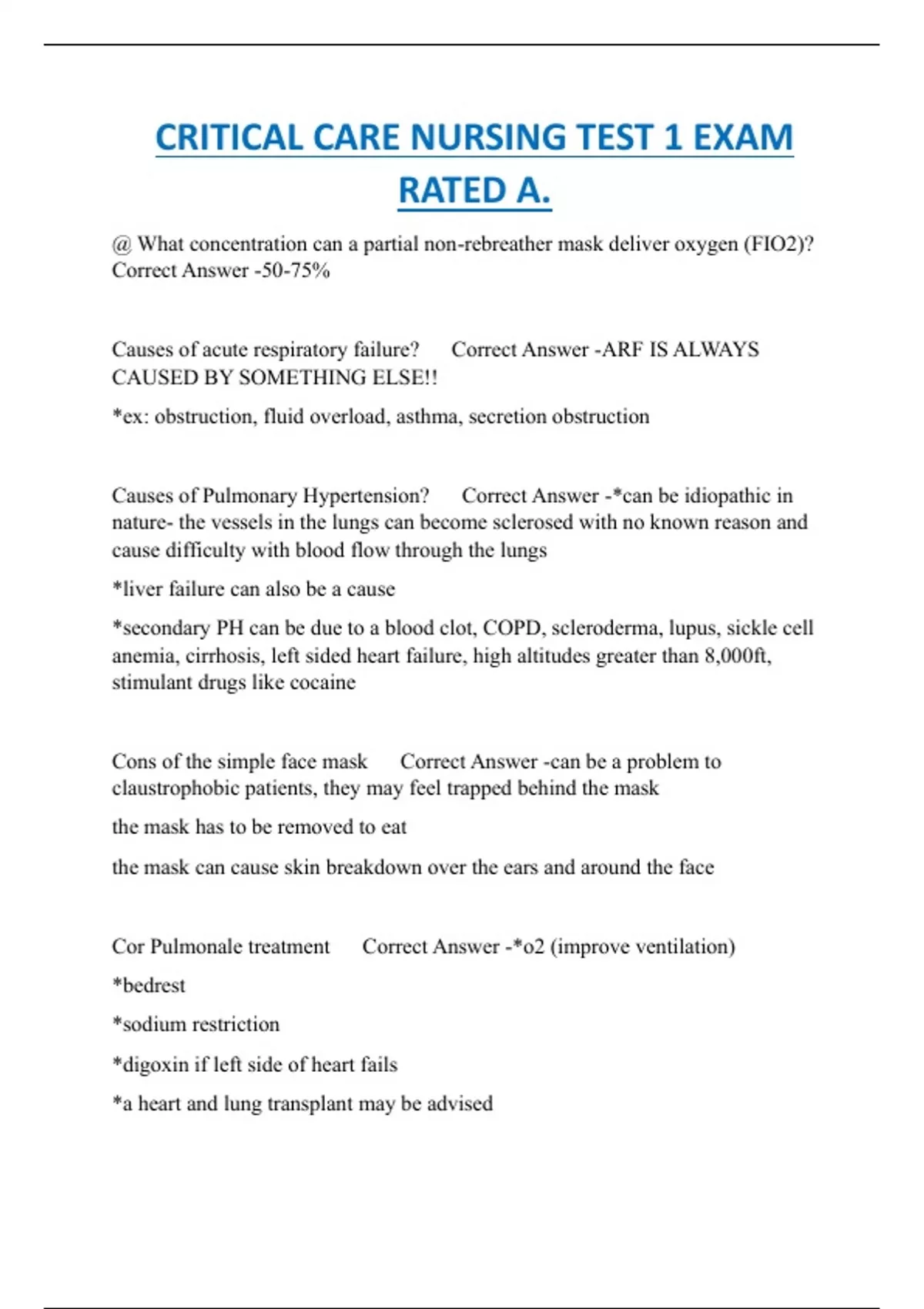 CRITICAL CARE NURSING TEST 1 EXAM RATED A.