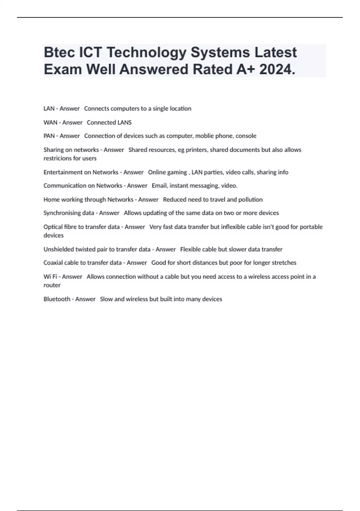 LAN - Answer Connects computers to a single location WAN - Answer Connected LANS PAN - Answer Connection of devices such as computer, moblie phone, console Sharing on networks - Answer Shared resources, eg printers, shared documents but also allows restricions for users Entertainment on Networks - Answer Online gaming , LAN parties, video calls, sharing info Communication on Networks - Answer Email, instant messaging, video. Home working through Networks - Answer Reduced need to travel and pollution Synchronising data - Answer Allows updating of the same data on two or more devices Optical fibre to transfer data - Answer Very fast data transfer but inflexible cable isn't good for portable devices Unshielded twisted pair to transfer data - Answer Flexible cable but slower data transfer Coaxial cable to transfer data - Answer Good for short distances but poor for longer stretches Wi Fi - Answer Allows connection without a cable but you need access to a wireless access point in a router Bluetooth - Answer Slow and wireless but built into many devices