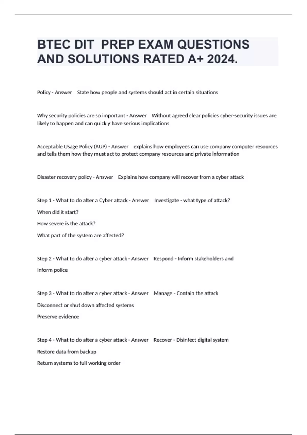Policy - Answer State how people and systems should act in certain situations Why security policies are so important - Answer Without agreed clear policies cyber-security issues are likely to happen and can quickly have serious implications Acceptable Usage Policy (AUP) - Answer explains how employees can use company computer resources and tells them how they must act to protect company resources and private information Disaster recovery policy - Answer Explains how company will recover from a cyber attack Step 1 - What to do after a Cyber attack - Answer Investigate - what type of attack? When did it start? How severe is the attack? What part of the system are affected? Step 2 - What to do after a cyber attack - Answer Respond - Inform stakeholders and Inform police Step 3 - What to do after a cyber attack - Answer Manage - Contain the attack Disconnect or shut down affected systems Preserve evidence Step 4 - What to do after a cyber attack - Answer Recover - Disinfect digital system Restore data from backup Return systems to full working order