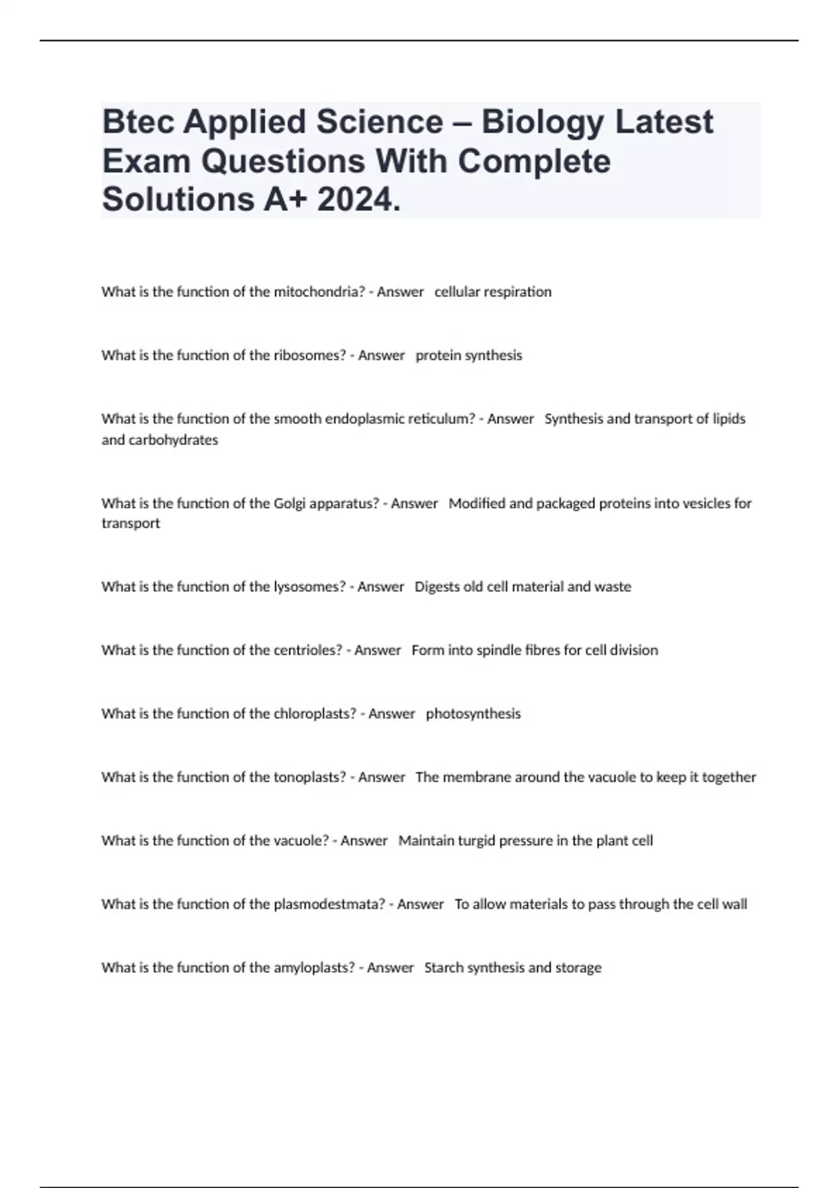 Btec Applied Science – Biology Latest Exam Questions With Complete Solutions A+ 2024.