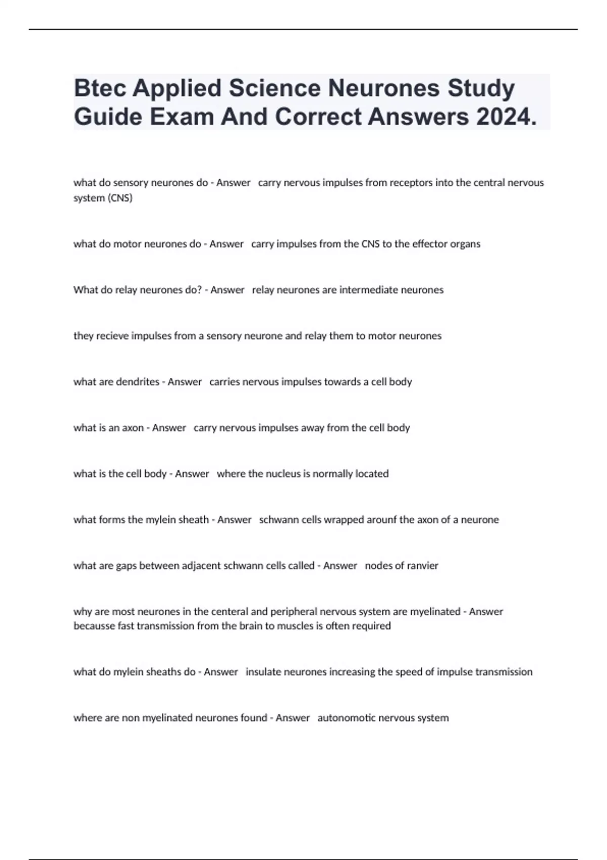 Btec Applied Science Neurones Study Guide Exam And Correct Answers 2024.