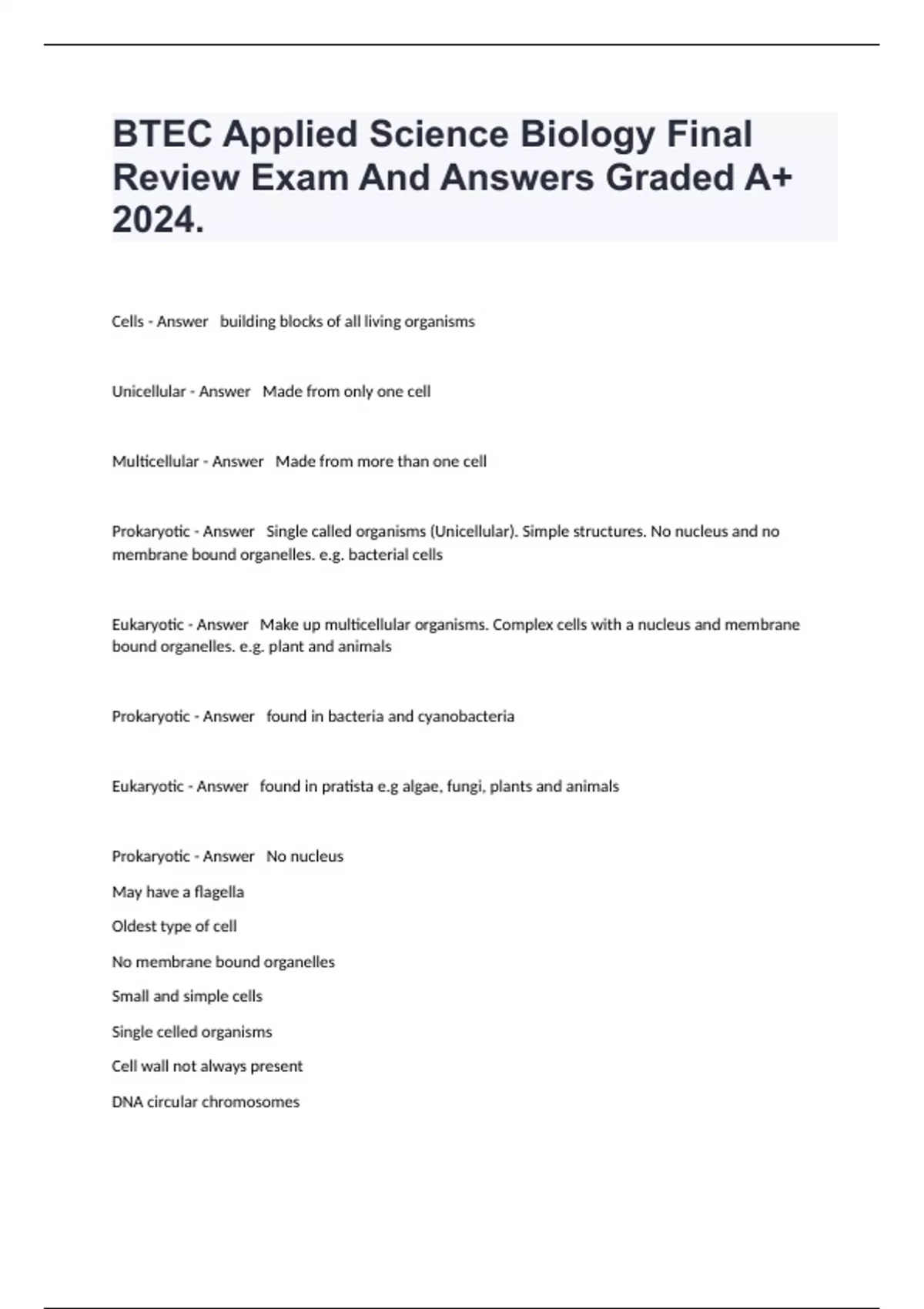 BTEC Applied Science Biology Final Review Exam And Answers Graded A+ 2024.