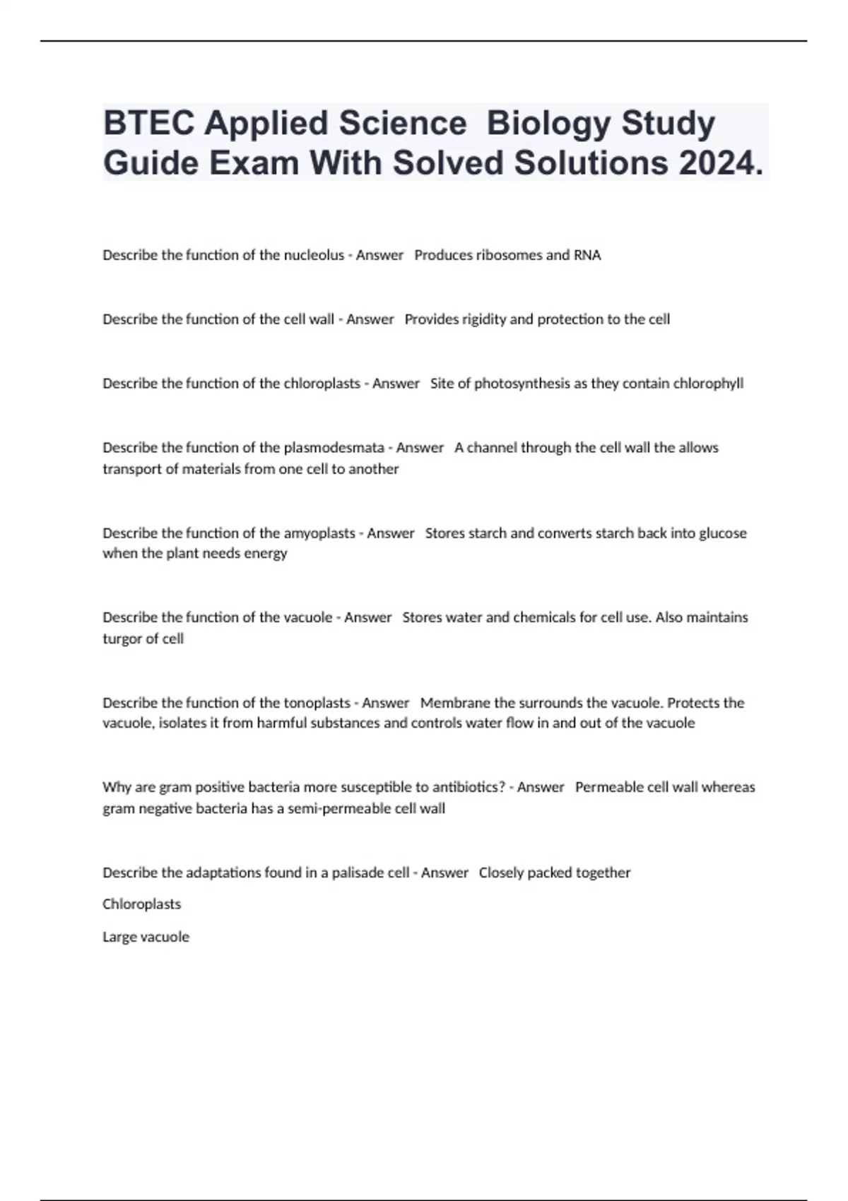 Describe the function of the nucleolus - Answer Produces ribosomes and RNA Describe the function of the cell wall - Answer Provides rigidity and protection to the cell Describe the function of the chloroplasts - Answer Site of photosynthesis as they contain chlorophyll Describe the function of the plasmodesmata - Answer A channel through the cell wall the allows transport of materials from one cell to another Describe the function of the amyoplasts - Answer Stores starch and converts starch back into glucose when the plant needs energy Describe the function of the vacuole - Answer Stores water and chemicals for cell use. Also maintains turgor of cell Describe the function of the tonoplasts - Answer Membrane the surrounds the vacuole. Protects the vacuole, isolates it from harmful substances and controls water flow in and out of the vacuole Why are gram positive bacteria more susceptible to antibiotics? - Answer Permeable cell wall whereas gram negative bacteria has a semi-permeable cell wall Describe the adaptations found in a palisade cell - Answer Closely packed together Chloroplasts Large vacuole
