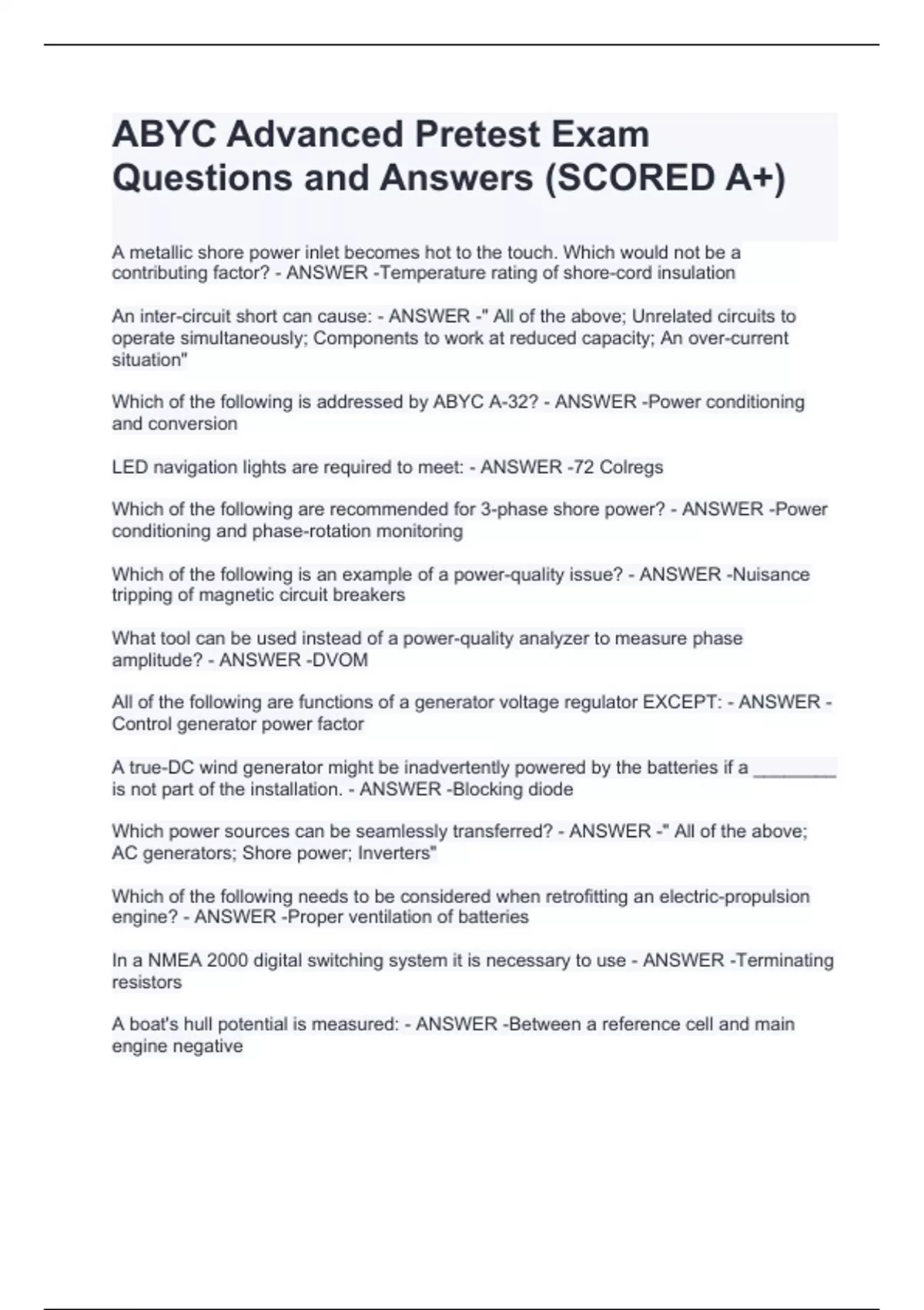 An inter-circuit short can cause: - ANSWER -" All of the above; Unrelated circuits to operate simultaneously; Components to work at reduced capacity; An over-current situation" Which of the following is addressed by ABYC A-32? - ANSWER -Power conditioning and conversion LED navigation lights are required to meet: - ANSWER -72 Colregs Which of the following are recommended for 3-phase shore power? - ANSWER -Power conditioning and phase-rotation monitoring Which of the following is an example of a power-quality issue? - ANSWER -Nuisance tripping of magnetic circuit breakers What tool can be used instead of a power-quality analyzer to measure phase amplitude? - ANSWER -DVOM All of the following are functions of a generator voltage regulator EXCEPT: - ANSWER -Control generator power factor A true-DC wind generator might be inadvertently powered by the batteries if a ________ is not part of the installation. - ANSWER -Blocking diode Which power sources can be seamlessly transferred? - ANSWER -" All of the above; AC generators; Shore power; Inverters" Which of the following needs to be considered when retrofitting an electric-propulsion engine? - ANSWER -Proper ventilation of batteries In a NMEA 2000 digital switching system it is necessary to use - ANSWER -Terminating resistors A boat's hull potential is measured: - ANSWER -Between a reference cell and main engine negative
