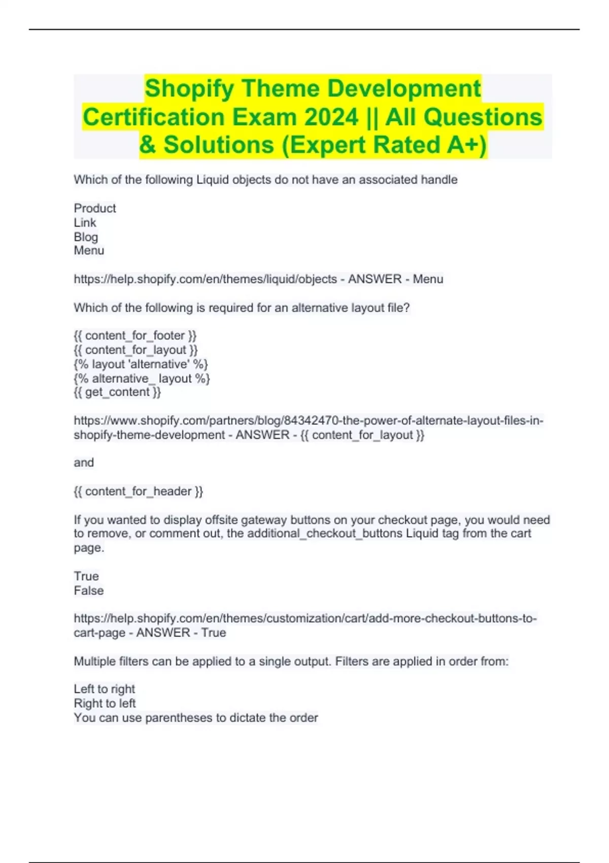 Shopify Theme Development Certification Exam 2024 || All Questions & Solutions (Expert Rated A+) Shopify Theme Development Certification Exam 2024 || All Questions & Solutions (Expert Rated A+) Which of the following Liquid objects do not have an associated handle Product Link Blog Menu Which of the following is required for an alternative layout file? {{ content_for_footer }} {{ content_for_layout }} {% layout 'alternative' %} {% alternative_ layout %} {{ get_content }} and {{ content_for_header }} If you wanted to display offsite gateway buttons on your checkout page, you would need to remove, or comment out, the additional_checkout_buttons Liquid tag from the cart page. True False Multiple filters can be applied to a single output. Filters are applied in order from: Left to right Right to left You can use parentheses to dictate the order What's the maximum size a theme zip file can be? 20 MB 50 MB 100 MB There is no limit - ANSWER - 50 MB