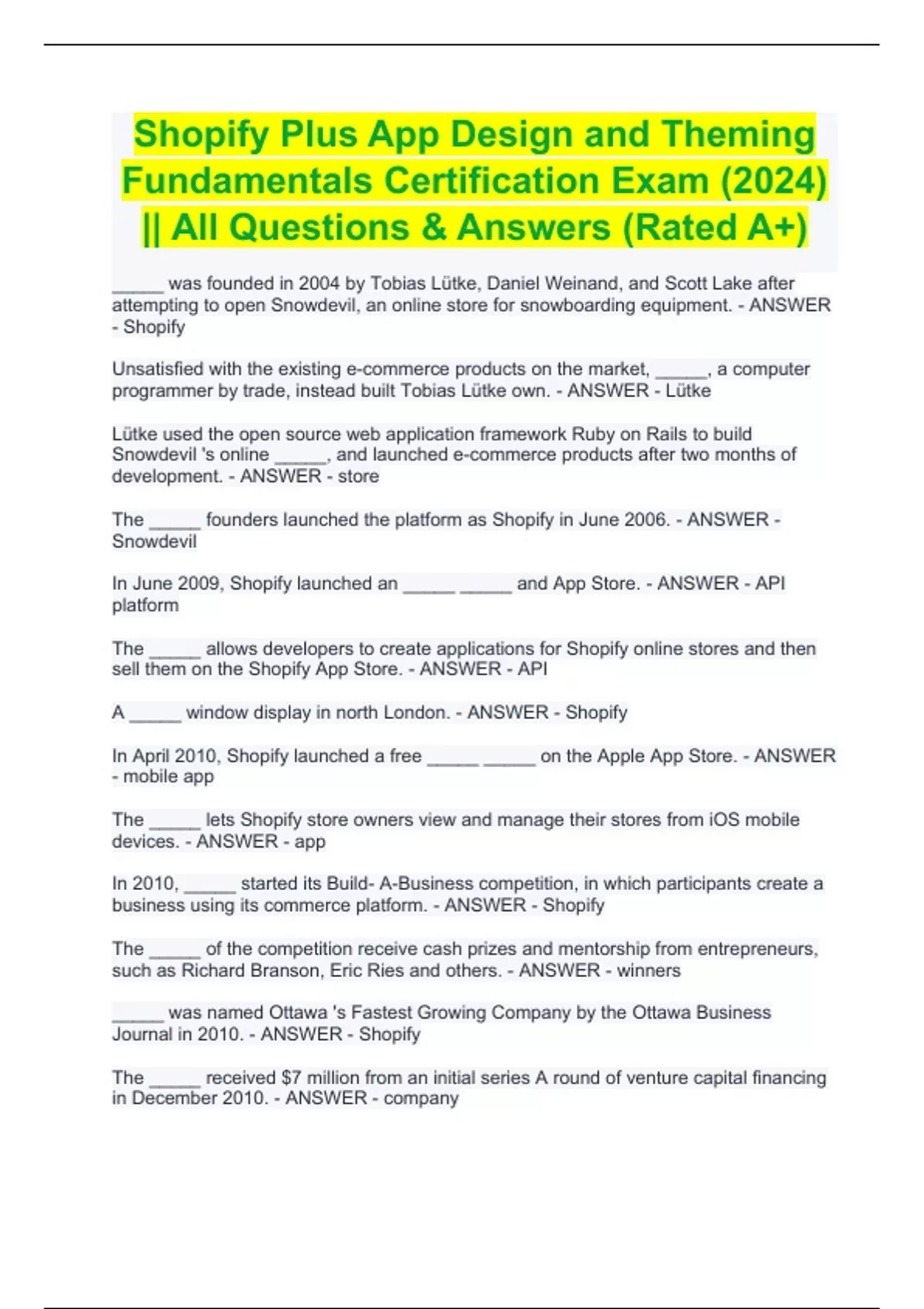 Shopify Plus App Design and Theming Fundamentals Certification Exam (2024) || All Questions & Answers (Rated A+) Shopify Plus App Design and Theming Fundamentals Certification Exam (2024) || All Questions & Answers (Rated A+) _____ was founded in 2004 by Tobias Lütke, Daniel Weinand, and Scott Lake after attempting to open Snowdevil, an online store for snowboarding equipment. - ANSWER - Shopify Unsatisfied with the existing e-commerce products on the market, _____, a computer programmer by trade, instead built Tobias Lütke own. - ANSWER - Lütke Lütke used the open source web application framework Ruby on Rails to build Snowdevil 's online _____, and launched e-commerce products after two months of development. - ANSWER - store The _____ founders launched the platform as Shopify in June 2006. - ANSWER - Snowdevil In June 2009, Shopify launched an _____ _____ and App Store. - ANSWER - API platform The _____ allows developers to create applications for Shopify online stores and then sell them on the Shopify App Store. - ANSWER - API A _____ window display in north London. - ANSWER - Shopify In April 2010, Shopify launched a free _____ _____ on the Apple App Store. - ANSWER - mobile app The _____ lets Shopify store owners view and manage their stores from iOS mobile devices. - ANSWER - app In 2010, _____ started its Build- A-Business competition, in which participants create a business using its commerce platform. - ANSWER - Shopify The _____ of the competition receive cash prizes and mentorship from entrepreneurs, such as Richard Branson, Eric Ries and others. - ANSWER - winners _____ was named Ottawa 's Fastest Growing Company by the Ottawa Business Journal in 2010. - ANSWER - Shopify The _____ received $7 million from an initial series A round of venture capital financing in December 2010. - ANSWER - company