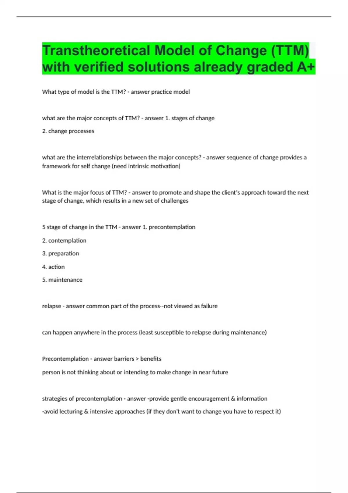 Transtheoretical Model of Change (TTM) with verified solutions already graded A+