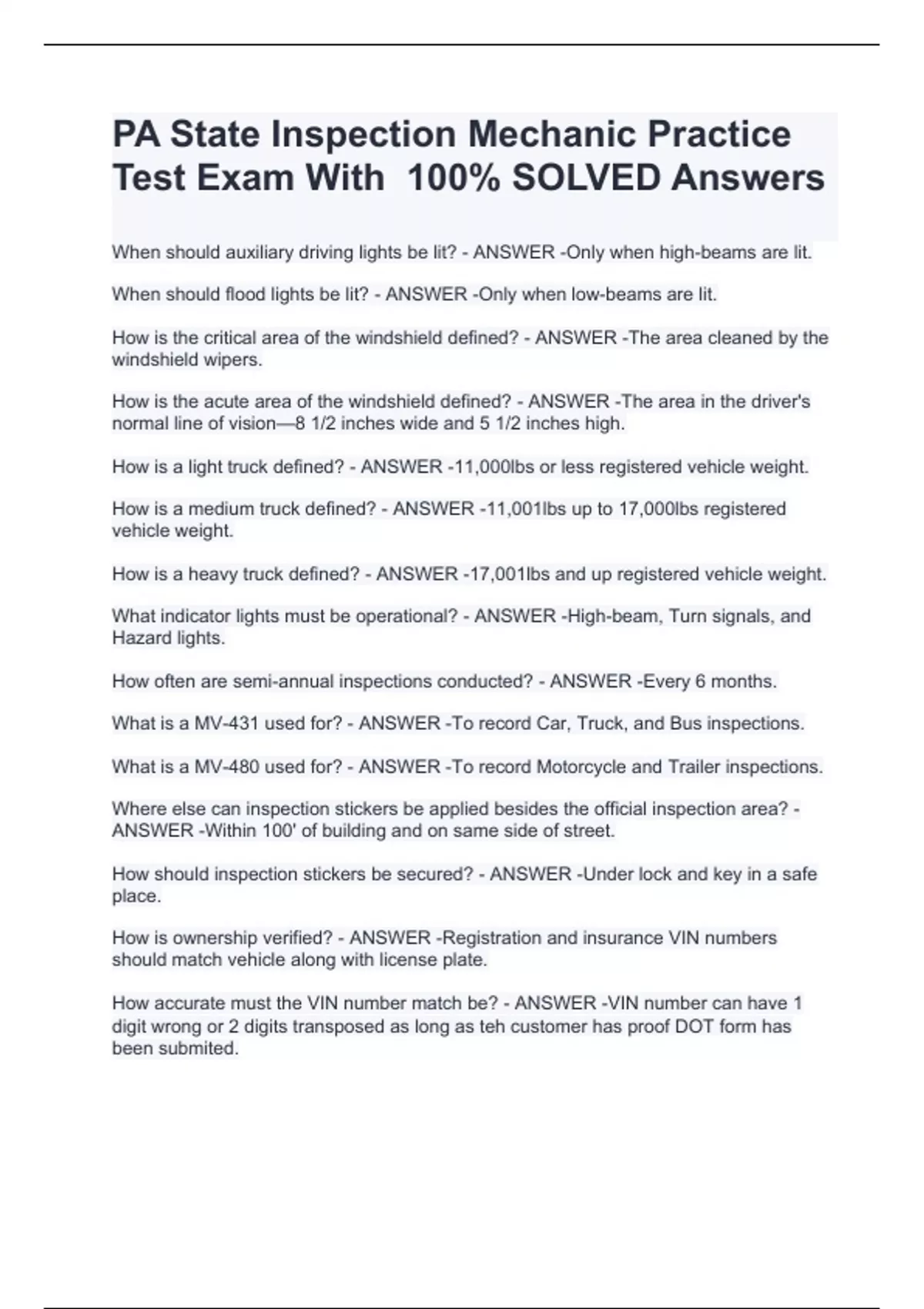 pa state inspection mechanic practice stuvia