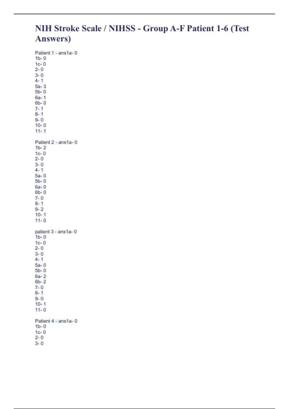 NIH Stroke Scale / NIHSS - Group A-F Patient 1-6 (Test Answers)
