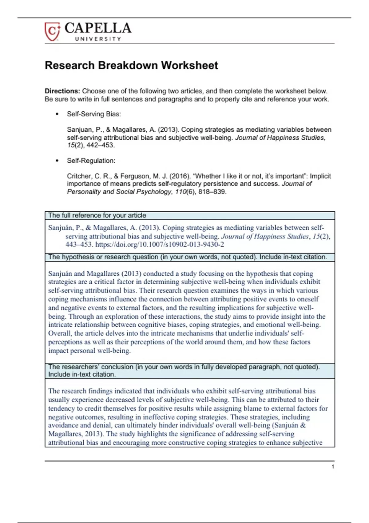 THIS WORKSHEET RECEIVED A DISTINGUISHED SCORE IN ALL COMPETENCIES. Analyze a journal article to fully understand its content and apply it to your practices. Article Used: "Coping Strategies as Mediating Variables Between Self-Serving Attributional Bias and Subjective Well-Being" by Sanjuan and Magallares (2013) - Listed the full reference. - Identified the hypothesis or research question. - Identified the overall conclusion. - Described the research method. - Described how you could apply this research to your daily personal or professional life. - Included appropriate in-text citations and journal references. - Addressed the appropriate audience and adhere to discipline-specific language.