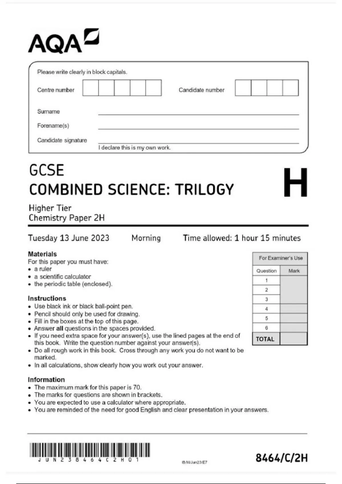 AQA GCSE COMBINED SCIENCE:TRILOGY CHEMISTRY PAPER 2H 2023(ACTUAL QUESTIONS)