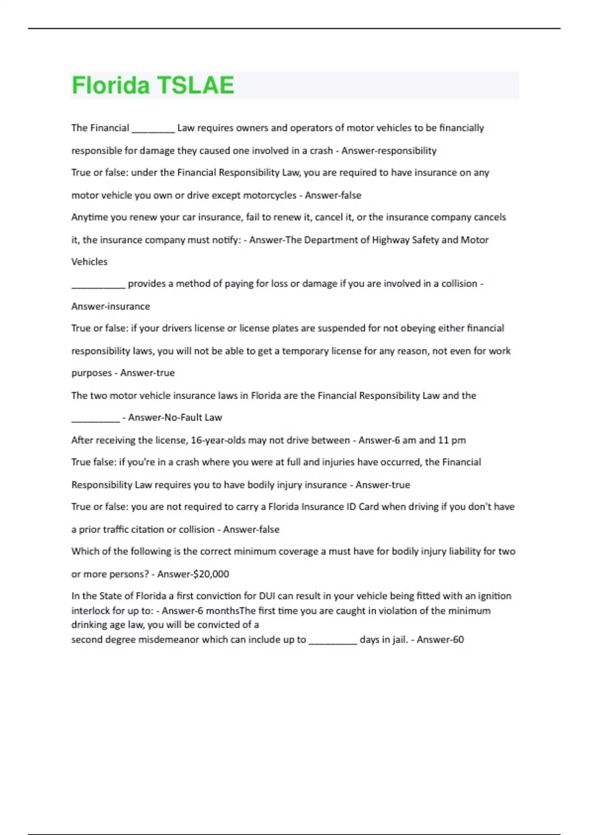 The Financial ________ Law requires owners and operators of motor vehicles to be financially responsible for damage they caused one involved in a crash - Answer-responsibility True or false: under the Financial Responsibility Law, you are required to have insurance on any motor vehicle you own or drive except motorcycles - Answer-false Anytime you renew your car insurance, fail to renew it, cancel it, or the insurance company cancels it, the insurance company must notify: - Answer-The Department of Highway Safety and Motor Vehicles __________ provides a method of paying for loss or damage if you are involved in a collision - Answer-insurance True or false: if your drivers license or license plates are suspended for not obeying either financial responsibility laws, you will not be able to get a temporary license for any reason, not even for work purposes - Answer-true The two motor vehicle insurance laws in Florida are the Financial Responsibility Law and the _________ - Answer-No-Fault Law After receiving the license, 16-year-olds may not drive between - Answer-6 am and 11 pm True false: if you're in a crash where you were at full and injuries have occurred, the Financial Responsibility Law requires you to have bodily injury insurance - Answer-true True or false: you are not required to carry a Florida Insurance ID Card when driving if you don't have a prior traffic citation or collision - Answer-false Which of the following is the correct minimum coverage a must have for bodily injury liability for two or more persons? - Answer-$20,000 In the State of Florida a first conviction for DUI can result in your vehicle being fitted with an ignition interlock for up to: - Answer-6 monthsThe first time you are caught in violation of the minimum drinking age law, you will be convicted of a second degree misdemeanor which can include up to _________ days in jail. - Answer-60