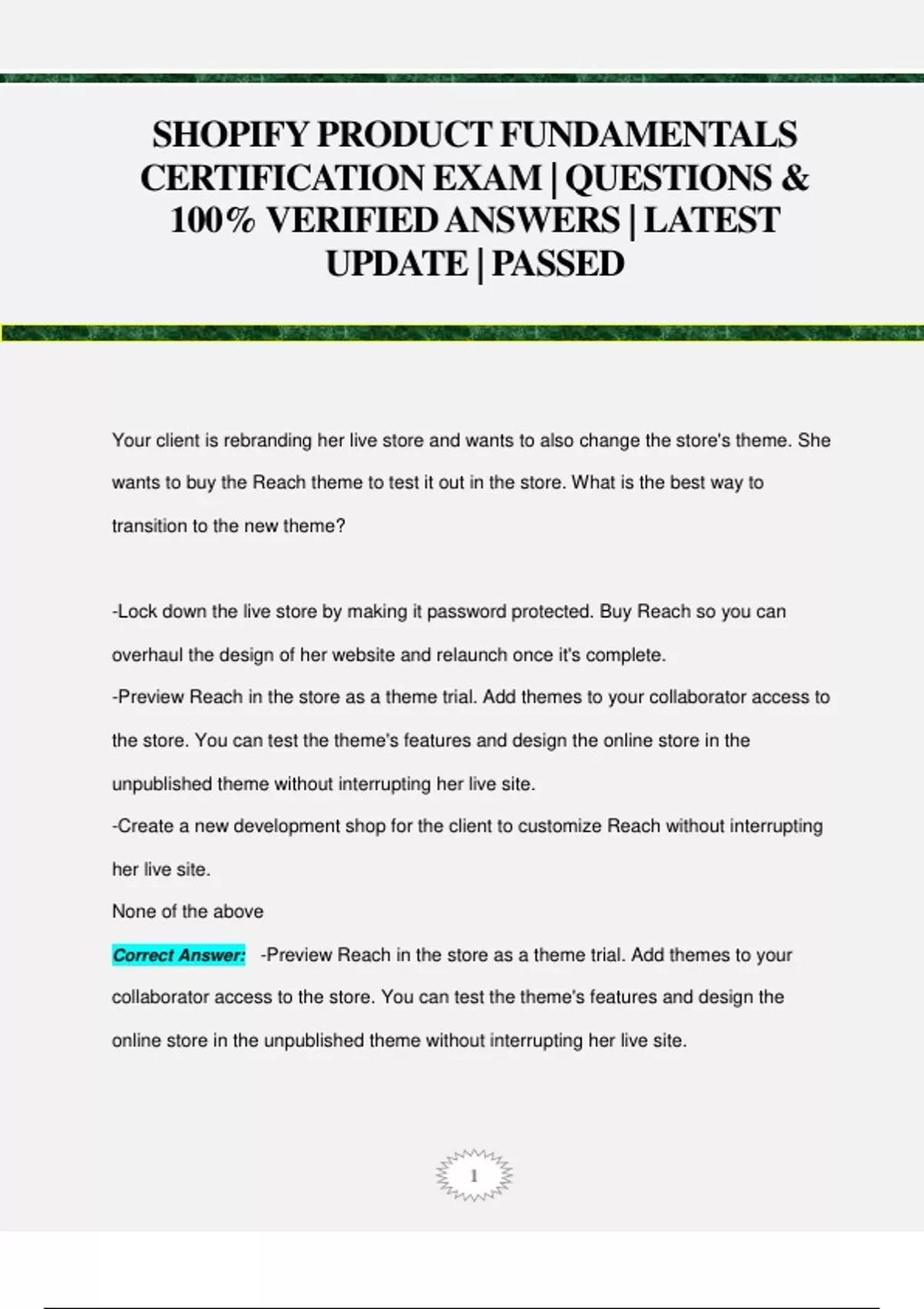SHOPIFY PRODUCT FUNDAMENTALS CERTIFICATION EXAM | QUESTIONS & 100% VERIFIEDANSWERS | LATEST UPDATE | PASSED Your client is rebranding her live store and wants to also change the store's theme. She wants to buy the Reach theme to test it out in the store. What is the best way to transition to the new theme? -Lock down the live store by making it password protected. Buy Reach so you can overhaul the design of her website and relaunch once it's complete. -Preview Reach in the store as a theme trial. Add themes to your collaborator access to the store. You can test the theme's features and design the online store in the unpublished theme without interrupting her live site. -Create a new development shop for the client to customize Reach without interrupting her live site. None of the above Correct Answer: -Preview Reach in the store as a theme trial. Add themes to your collaborator access to the store. You can test the theme's features and design the online store in the unpublished theme without interrupting her live site. 2 Paid themes are subject to what type of split between Theme Partner and Shopify? -60/40 -70/30 -80/20 -Shopify Theme Partners keep 100% of sales Correct Answer: -70/30 To test the checkout of a store using Bogus Gateway, the store must be (Select all that apply): -In the development environment -A live store Correct Answer: -In the development environment -A live store 3 A client wants to customize the Checkout page of their online store, what options do they have if they are on a Shopify Basic plan? They can customize the checkout... -With Theme Settings -Using the `d` template -Using shipping scripts -All of the above Correct Answer: -Using the `d` template