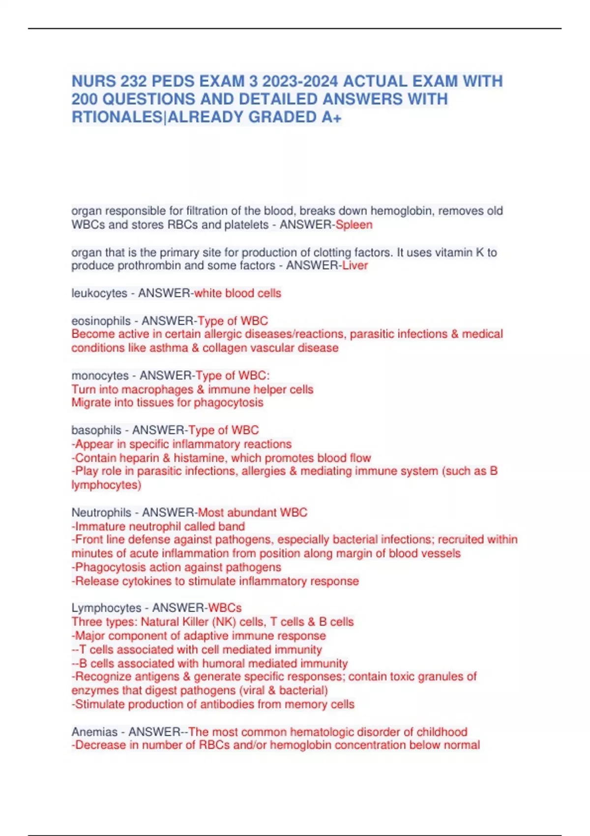 NURS 232 PEDS EXAM ACTUAL EXAM WITH 200 QUESTIONS AND DETAILED ANSWERS WITH RTIONALES|ALREADY GRADED A+