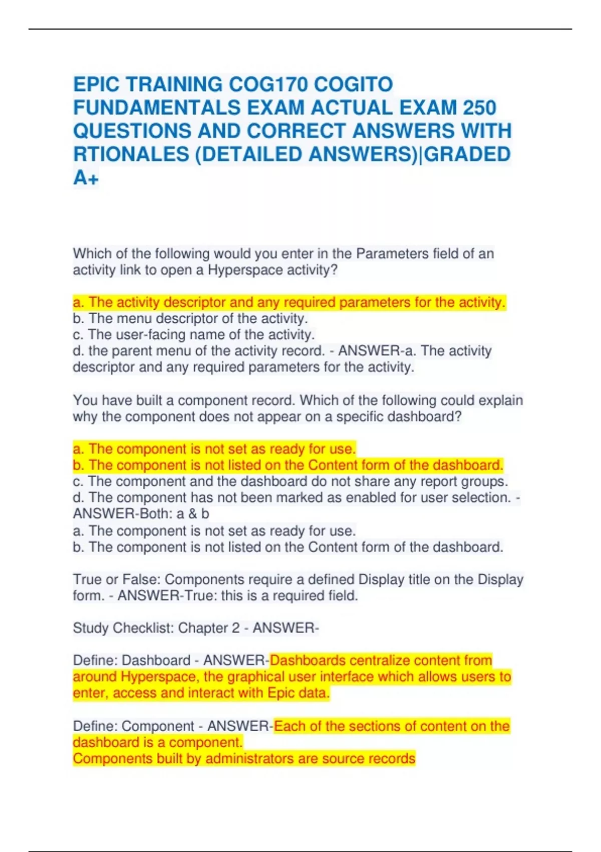 EPIC TRAINING COG170 COGITO FUNDAMENTALS EXAM ACTUAL EXAM 250 QUESTIONS AND CORRECT ANSWERS WITH RTIONALES (DETAILED ANSWERS)|GRADED A+