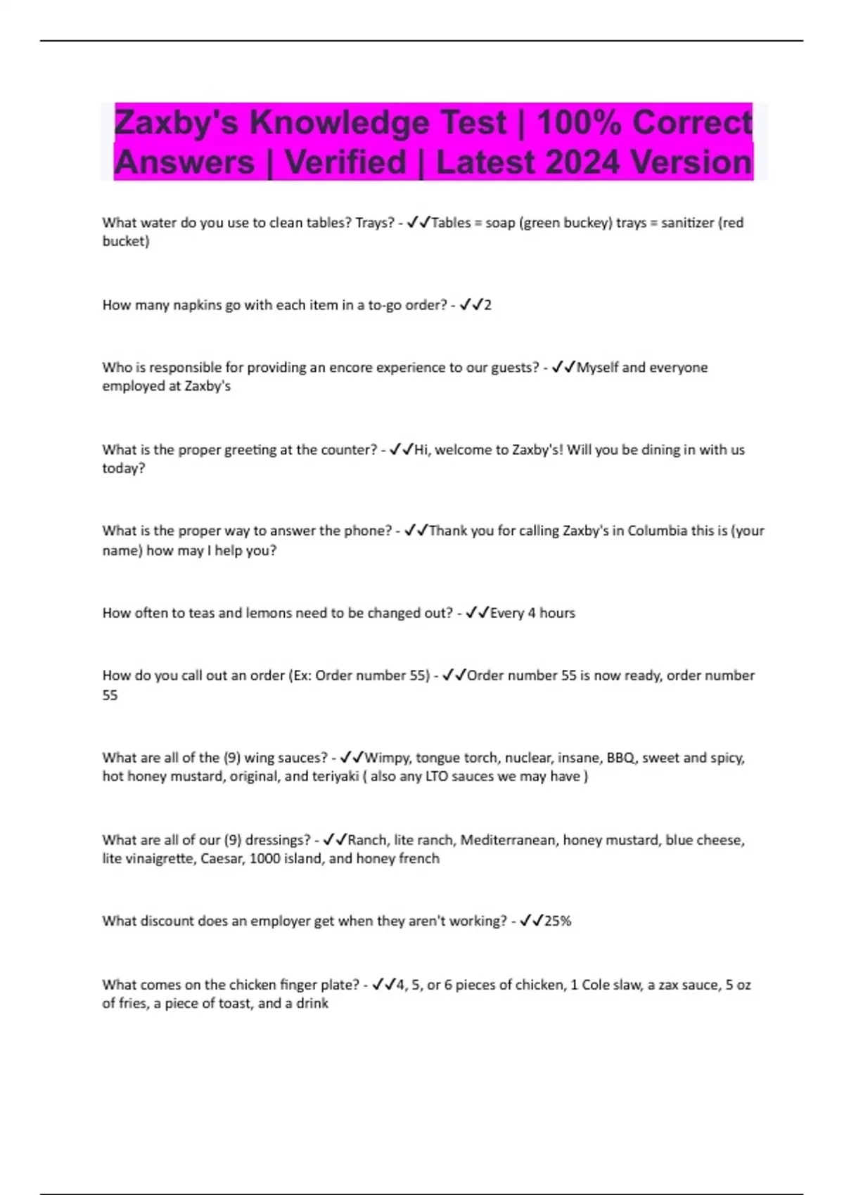 Zaxby's Knowledge Test | 100% Correct Answers | Verified | Latest 2024 Version