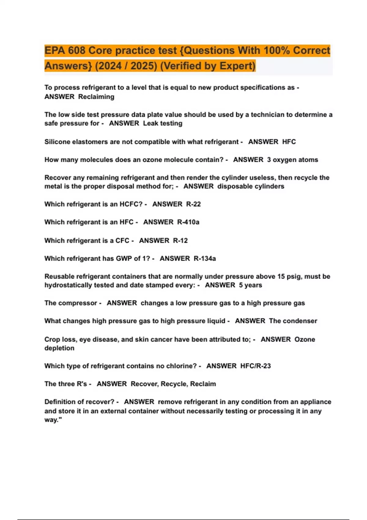 EPA 608 Core practice test {Questions With 100% Correct Answers} (2024 / 2025) (Verified by Expert)