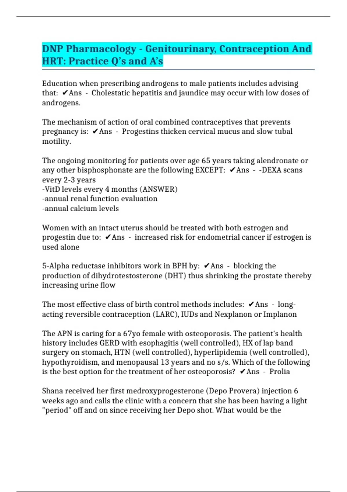 DNP Pharmacology - Genitourinary, Contraception And HRT: Practice Q’s and A’s