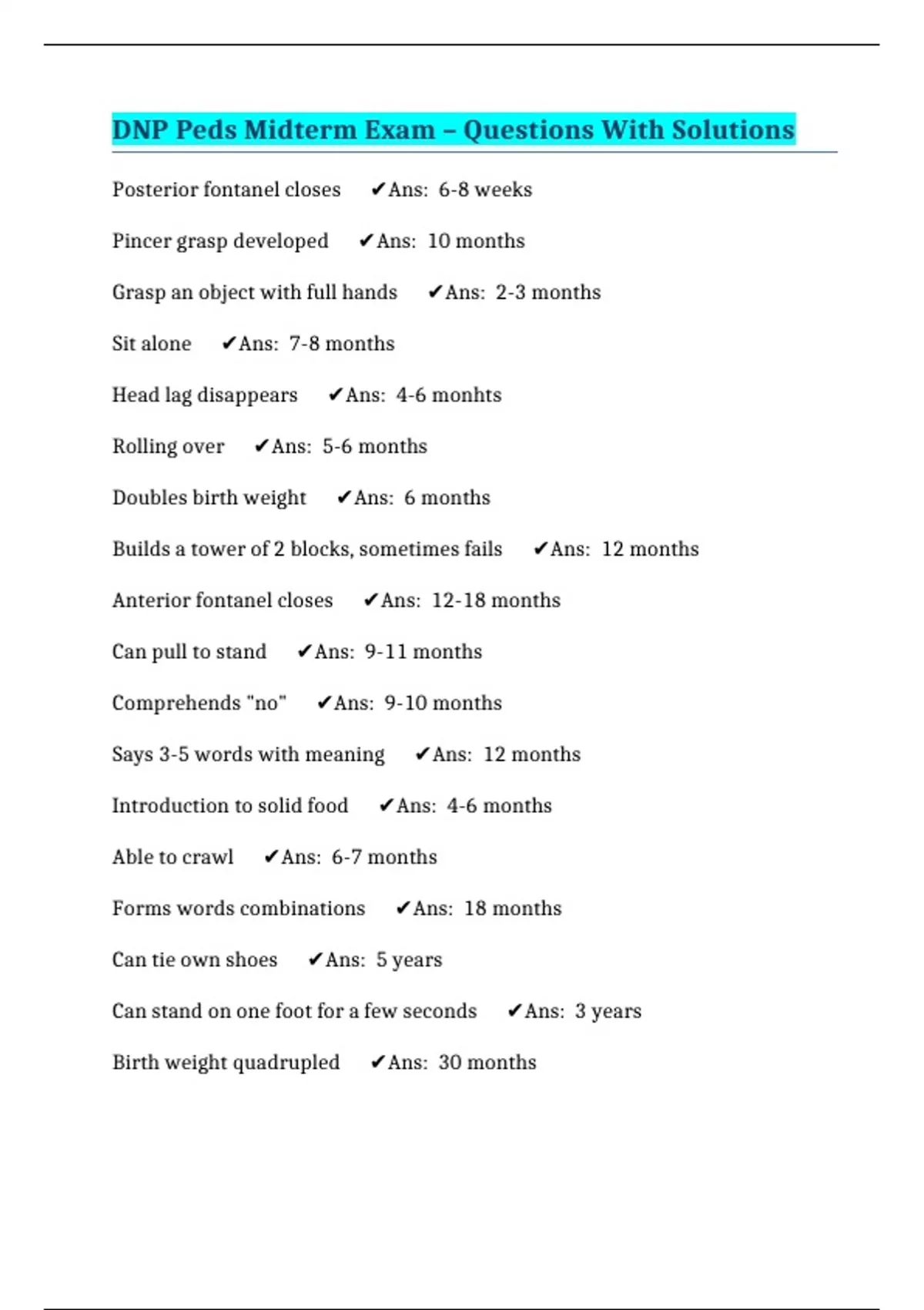 DNP Peds Midterm Exam – Questions With Solutions