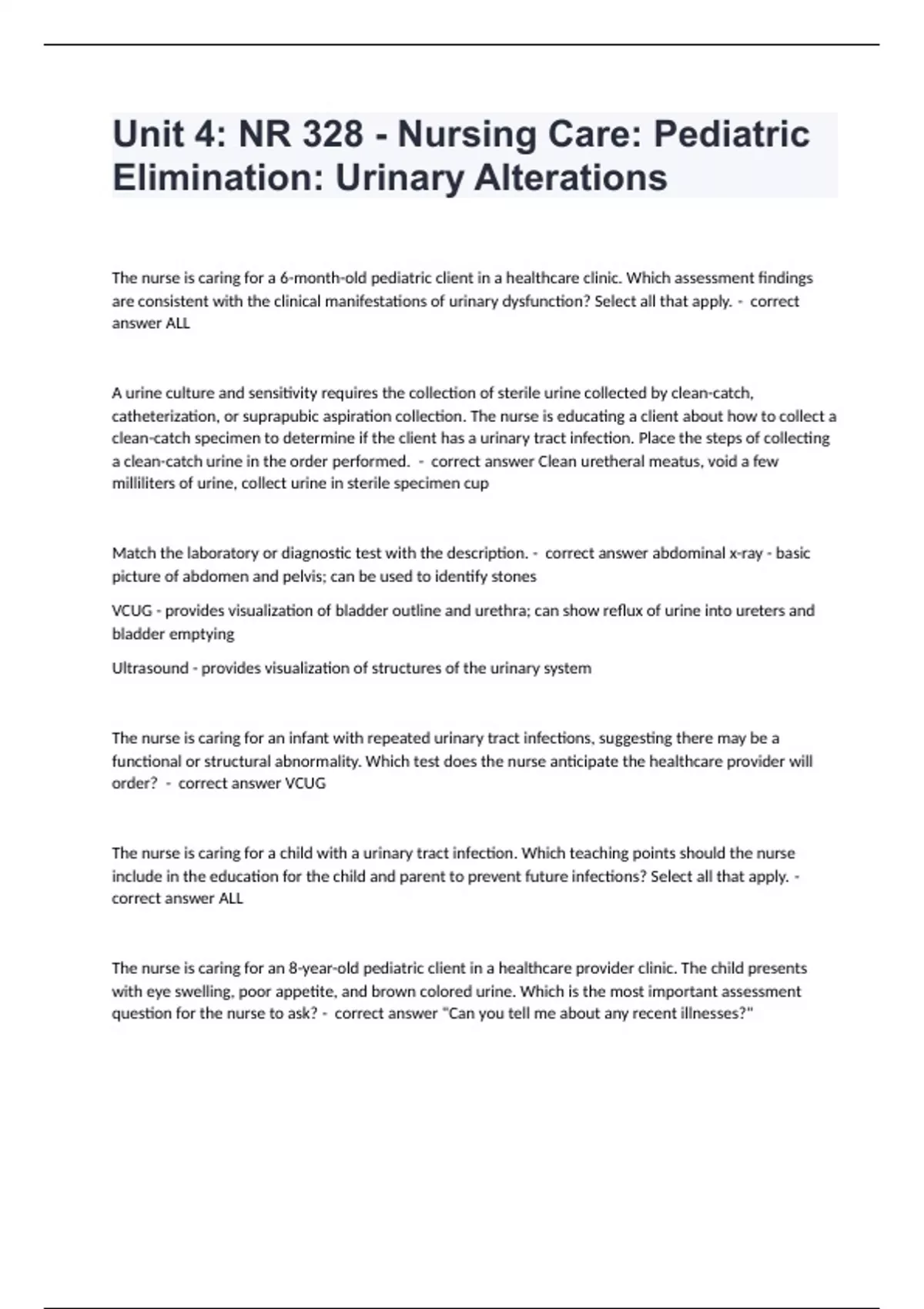 Unit 4: NR 328 - Nursing Care: Pediatric Elimination: Urinary Alterations with 100% correct answers 2024/2025