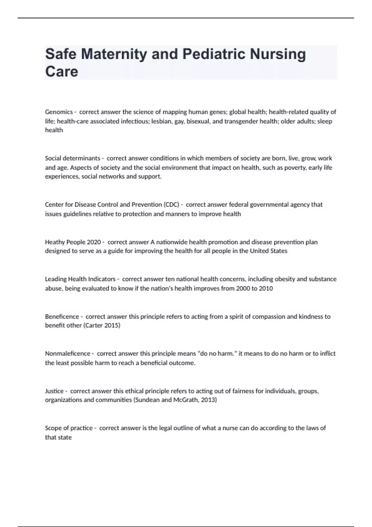Safe Maternity and Pediatric Nursing CareGenomics - correct answer the science of mapping human genes; global health; health-related quality of life; health-care associated infectious; lesbian, gay, bisexual, and transgender health; older adults; sleep health Social determinants - correct answer conditions in which members of society are born, live, grow, work and age. Aspects of society and the social environment that impact on health, such as poverty, early life experiences, social networks and support. Center for Disease Control and Prevention (CDC) - correct answer federal governmental agency that issues guidelines relative to protection and manners to improve health Heathy People 2020 - correct answer A nationwide health promotion and disease prevention plan designed to serve as a guide for improving the health for all people in the United States Leading Health Indicators - correct answer ten national health concerns, including obesity and substance abuse, being evaluated to know if the nation's health improves from 2000 to 2010 Beneficence - correct answer this principle refers to acting from a spirit of compassion and kindness to benefit other (Carter 2015) Nonmaleficence - correct answer this principle means "do no harm." it means to do no harm or to inflict the least possible harm to reach a beneficial outcome. Justice - correct answer this ethical principle refers to acting out of fairness for individuals, groups, organizations and communities (Sundean and McGrath, 2013) Scope of practice - correct answer is the legal outline of what a nurse can do according to the laws of that state