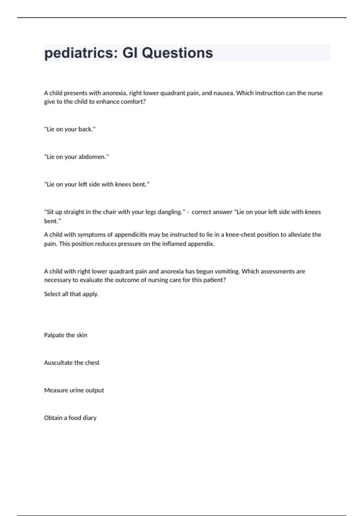 pediatrics: GI QuestionsA child presents with anorexia, right lower quadrant pain, and nausea. Which instruction can the nurse give to the child to enhance comfort? "Lie on your back." "Lie on your abdomen." "Lie on your left side with knees bent." "Sit up straight in the chair with your legs dangling." - correct answer "Lie on your left side with knees bent." A child with symptoms of appendicitis may be instructed to lie in a knee-chest position to alleviate the pain. This position reduces pressure on the inflamed appendix. A child with right lower quadrant pain and anorexia has begun vomiting. Which assessments are necessary to evaluate the outcome of nursing care for this patient? Select all that apply. Palpate the skin Auscultate the chest Measure urine output Obtain a food diary