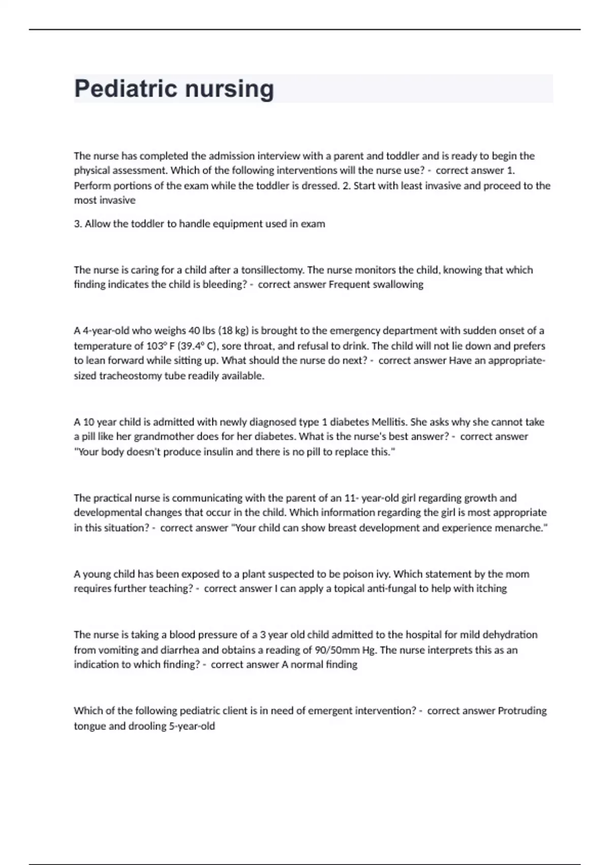 Pediatric NursingExamples of stress experienced by toddlers - correct answer 1. separation anxiety from parents, grief reactions 2. regression 3. refusal to eat 4. difficulty sleeping Three phases of separation anxiety and behavioral responses exhibited during each phase - correct answer 1. protest; clings to parent to force them to stay 2. despair, inactive + withdrawn and regress 3. detachment, denial, after prolonged separation , denies need for parents lvoe, affection to nurses Nursing interventions to reduce separation anxiety - correct answer 1. encourage family contact 2. familiar belonging brought from home 3. provide therapeutic play 4. accept regression 5. consistent routine with familiar staff 6. extra cuddling and holding Example of a coping strategy found amongst toddlers when in stress - correct answer throwing games List the major developmental tasks for toddlers - correct answer 1. development of autonomy 2.. control environment 3. act of movement with no restraining Identify examples of collaborative efforts to assist toddlers with control and mobility - correct answer 1. assist child with ambulation within their control 2. throwing games, vent frustrations 3. child life specialist, modified toys
