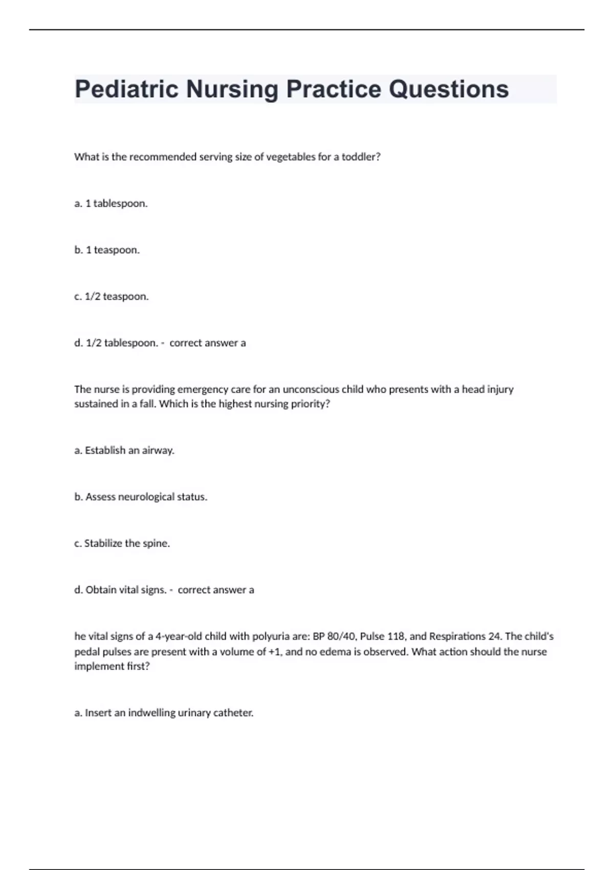Pediatric Nursing Practice QuestionsWhat is the recommended serving size of vegetables for a toddler? a. 1 tablespoon. b. 1 teaspoon. c. 1/2 teaspoon. d. 1/2 tablespoon. - correct answer a The nurse is providing emergency care for an unconscious child who presents with a head injury sustained in a fall. Which is the highest nursing priority? a. Establish an airway. b. Assess neurological status. c. Stabilize the spine. d. Obtain vital signs. - correct answer a he vital signs of a 4-year-old child with polyuria are: BP 80/40, Pulse 118, and Respirations 24. The child's pedal pulses are present with a volume of +1, and no edema is observed. What action should the nurse implement first? a. Insert an indwelling urinary catheter.