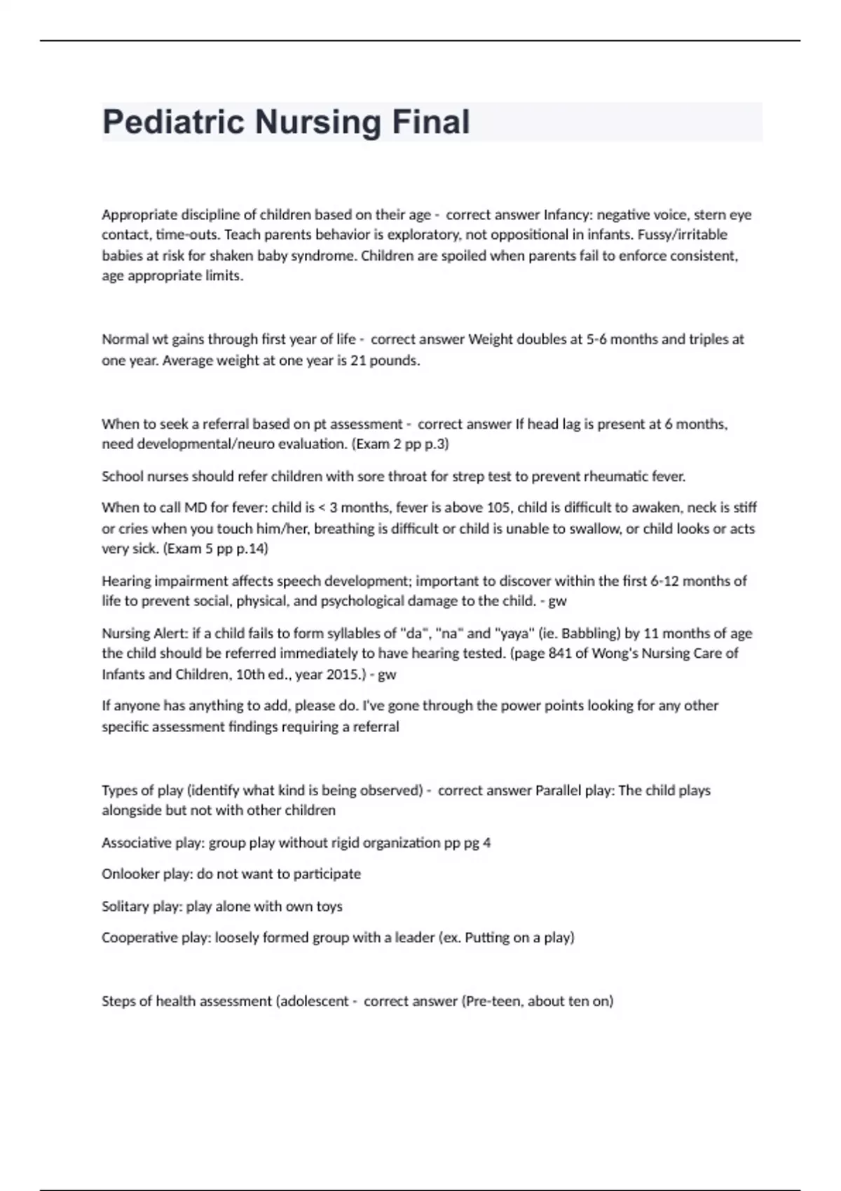 Pediatric Nursing Final Appropriate discipline of children based on their age - correct answer Infancy: negative voice, stern eye contact, time-outs. Teach parents behavior is exploratory, not oppositional in infants. Fussy/irritable babies at risk for shaken baby syndrome. Children are spoiled when parents fail to enforce consistent, age appropriate limits. Normal wt gains through first year of life - correct answer Weight doubles at 5-6 months and triples at one year. Average weight at one year is 21 pounds. When to seek a referral based on pt assessment - correct answer If head lag is present at 6 months, need developmental/neuro evaluation. (Exam 2 pp p.3) School nurses should refer children with sore throat for strep test to prevent rheumatic fever. When to call MD for fever: child is < 3 months, fever is above 105, child is difficult to awaken, neck is stiff or cries when you touch him/her, breathing is difficult or child is unable to swallow, or child looks or acts very sick. (Exam 5 pp p.14) Hearing impairment affects speech development; important to discover within the first 6-12 months of life to prevent social, physical, and psychological damage to the child. - gw Nursing Alert: if a child fails to form syllables of "da", "na" and "yaya" (ie. Babbling) by 11 months of age the child should be referred immediately to have hearing tested. (page 841 of Wong's Nursing Care of Infants and Children, 10th ed., year 2015.) - gw If anyone has anything to add, please do. I've gone through the power points looking for any other specific assessment findings requiring a referral Types of play (identify what kind is being observed) - correct answer Parallel play: The child plays alongside but not with other children Associative play: group play without rigid organization pp pg 4 Onlooker play: do not want to participate Solitary play: play alone with own toys Cooperative play: loosely formed group with a leader (ex. Putting on a play) Steps of health assessment (adolescent - correct answer (Pre-teen, about ten on)