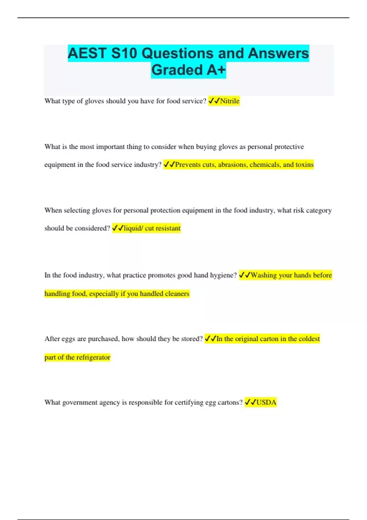 AEST S10 Questions and Answers Graded A+ What type of gloves should you have for food service? Nitrile What is the most important thing to consider when buying gloves as personal protective equipment in the food service industry? Prevents cuts, abrasions, chemicals, and toxins When selecting gloves for personal protection equipment in the food industry, what risk category should be considered? liquid/ cut resistant In the food industry, what practice promotes good hand hygiene? Washing your hands before handling food, especially if you handled cleaners After eggs are purchased, how should they be stored? In the original carton in the coldest part of the refrigerator What government agency is responsible for certifying egg cartons? USDA Why should eggs be washed? To remove bacteria because they come from the same hole as feces What poultry product is pasteurized? Eggs Pasteurization is not required for which type of egg or egg product? Whole Eggs (In the shell) What are the egg grades from best to worst? AA, A, B Eggs sold in the marketplace must be good as or better than which United States consumer quality standard? Grade A What is the process used to look for egg interior quality? Candling What is the primary bacteria that can be ingested from unwashed eggs? Salmonella What is the most common cause of food waste? Confusion over food labeling Which food product date-labeling phrase always relates to food safety? Expiration Date What of the following are required for food safety? expiration, recommended, best used by in infant formula. What factors are considered by the manufacture in determining food quality dates? Length of time and the temperature food is held